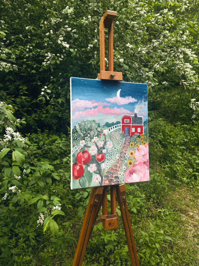 Onko tässä sinun unelmasi? Vanha punainen hirsitalo, auringonkukat, omenapuu ja auringonlaskun rauha. 33 x 41 cm akryylimaalaus kankaalla. Valkoiseksi maalatut reunat luovat kehysmäistä ryhtiä. Ripustusvalmis.