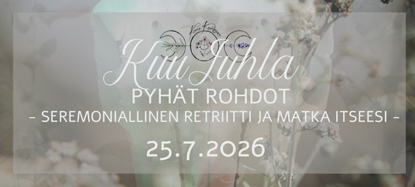 Kasvien henget ja väki johdattavat sinut syvemmän tietoisuuden äärelle. Rumpu ja löyly toimivat apuhenkinä matkallasi. Yhdeksän puun, yrttien ja Panun väki sekä rajanylityksen kasvi-auttajat ovat matkalla mukanasi. Lähde kokemaan KuuJuhlan Pyhät Rohdot - retriitti ja matka itseesi, sieluusi ja syvempään tietoisuuteen, oman itsesi tuntemiseen. Päivään sisältyy sekä sielun että ruumiin ravintoa sekä yhdessäolon ja läsnäolon rauhoittavia kokemuksia.