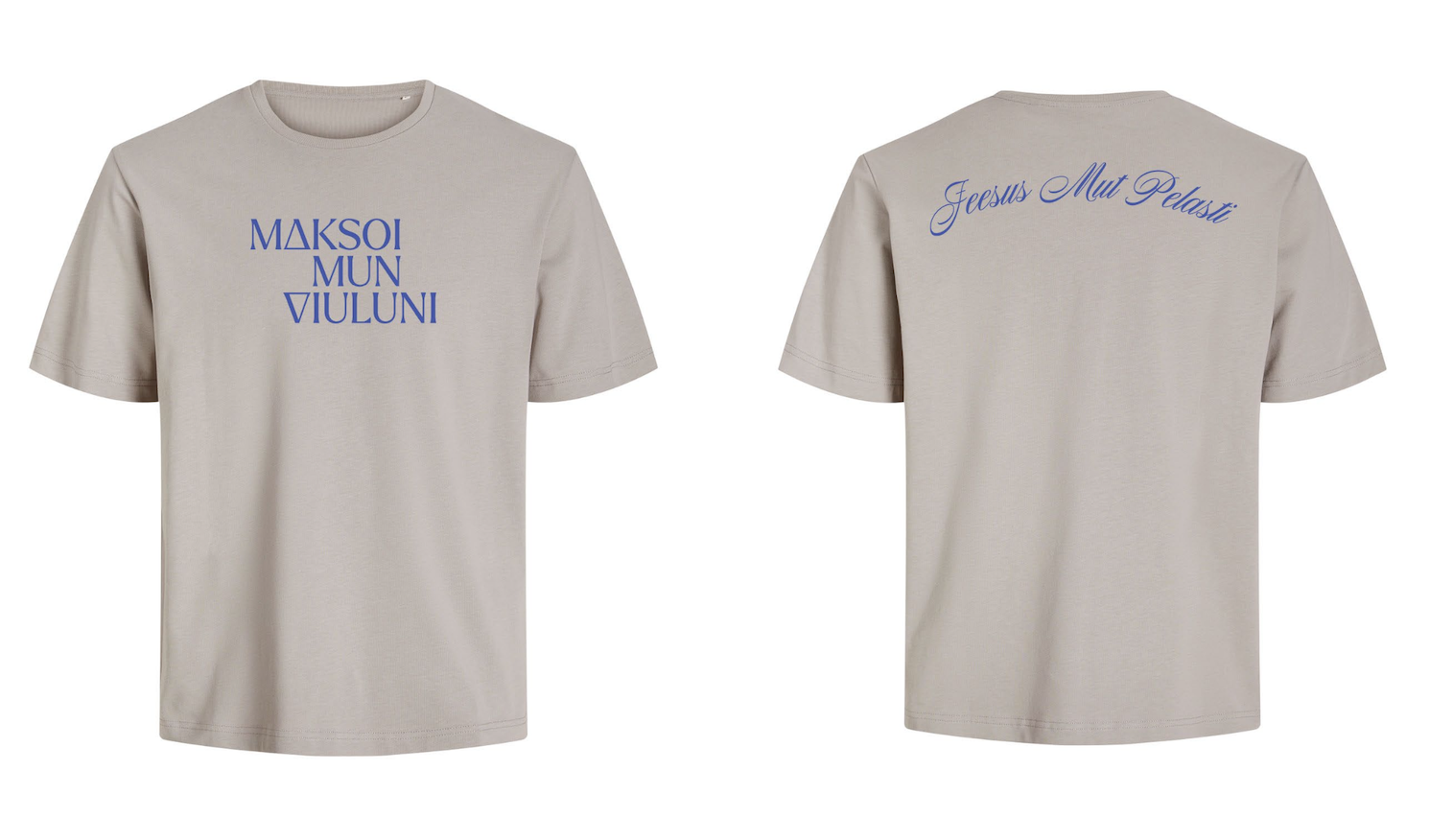 Rinnassa painettuna lainaus uudesta biisistämme "Maksoi mun viuluni" ja selässä "Jeesus mut pelasti".