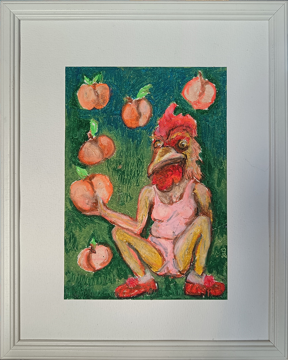 Öljypastellityö kierrätyskehyksissä. Koko kehyksen kanssa 32x26 cm. Kehysten materiaalina maalattu puu, ei lasia tai pleksiä. Postikulut lisätään hintaan.