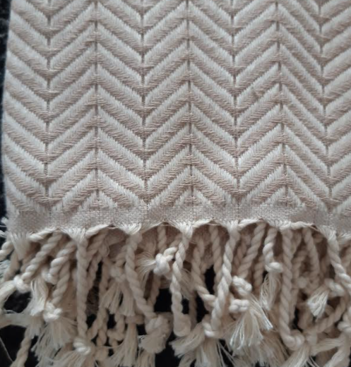 Vaalea hiekka-valkea. Vahvaa kaunista kudosta, koko 100 cm x 200 cm. Erittäin korkealaatuinen kangas. Pese pari kertaa, että pehmenee. 100 % puuvillaa. Hapsut ovat nyöritetyt, käsityönä. Valmistettu Turkissa. Pesu +40-60C.