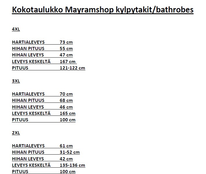 Hamam-pyyhekankaasta valmistettu hupullinen kylpytakki, hapsut taskujen suussa, hihoissa sekä helmassa. 100 % puuvillaa. Ihastut tähän hengittävään materiaaliin, etkä haluaisi luopua siitä helposti edes aamulla jos käytät sitä aamutakkina, sillä se tuntuu todella hyvällä päällä. Tilaa aina 1 koko suurempi koko, koska takki kutistuu pesussa yhde koon. Pesu 30-40 C. Vedä pesun jälkeen hihoja kuosiin. Älä laita kuivaajaan. Hartialeveys 60-62 cm, leveys keskeltä ympärysmitta 155 cm, pituus olkapäästä helmaan 113 cm, hihan pituus olkapäästä hihansuuhun 58 cm.