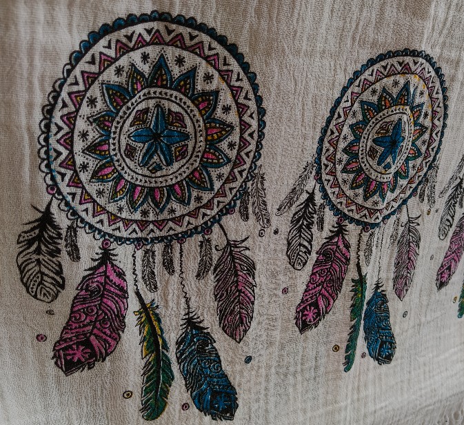 Todella laadukasta tuplapuuvillaa, tätä voit käyttää niin pyyhkeenä kuin pöytäliinana. Harsomainen kangas on erittäin imukykyinen ja kestää 60 asteen pesun. Värillisessä kuviossa on vihreää, pinkkiä ja mustaa väriä. Väri ei leviä pesussa, mutta ajan myötä voi hieman vaalentua. Mitat: 80 x 190 cm.