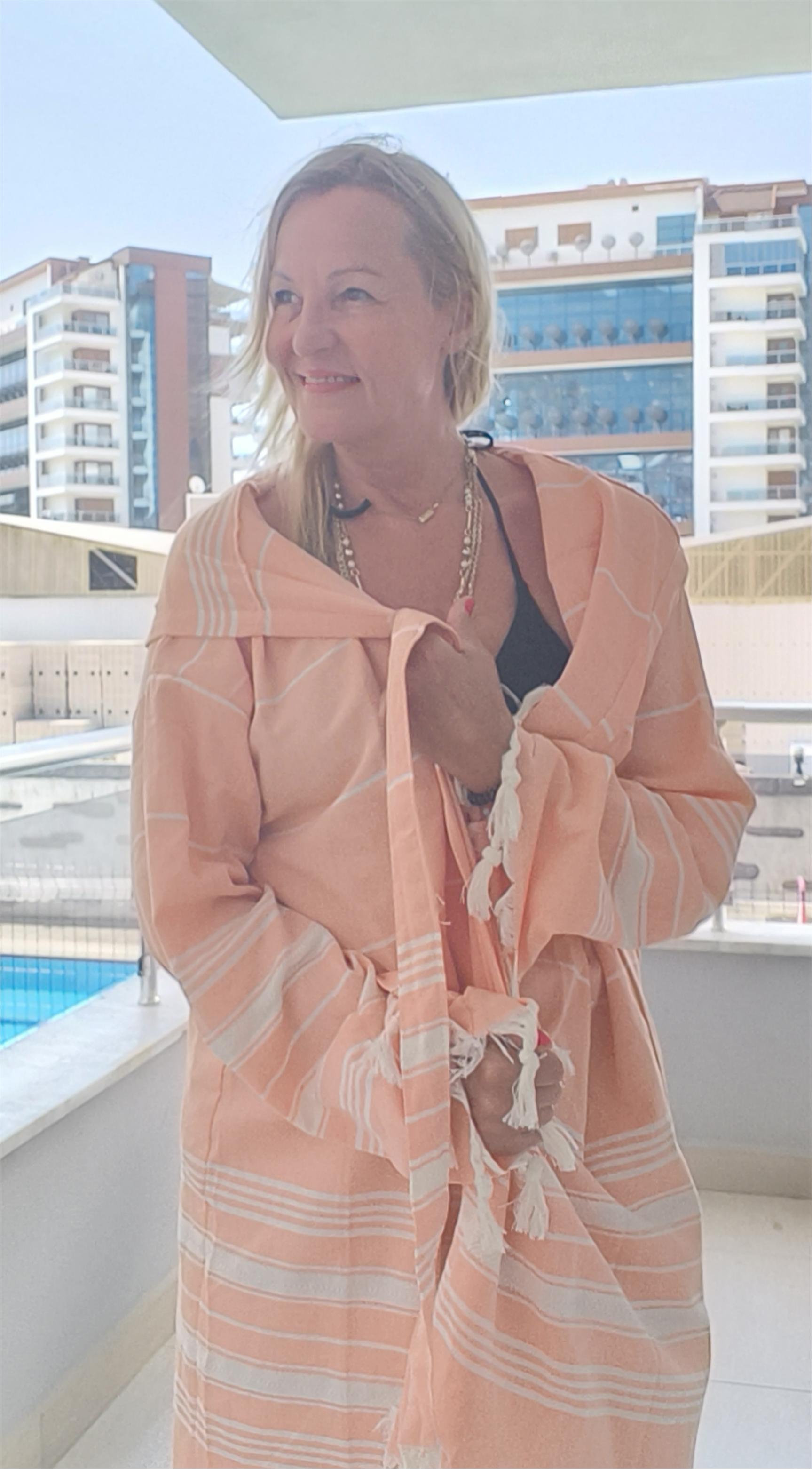 Kauniin värinen 100% puuvillasta valmistettu aamu/kylpytakki, reilu mitoitus. Esipesty, joten ei kutistu pesussa. Pwsu 40-60C. Hupullinen, hapsut hihansuissa ja helmoissa.