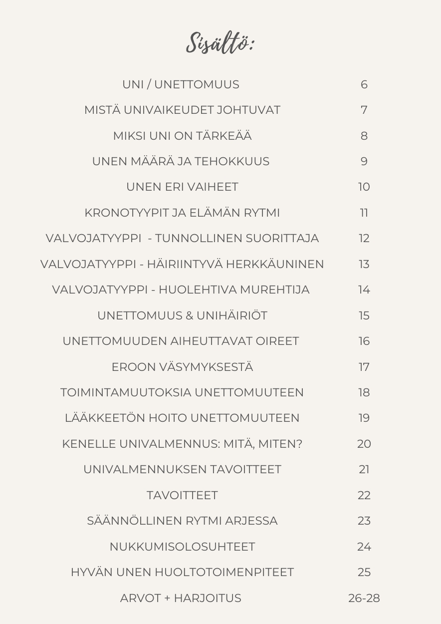 Olen tuonut tähän sinulle tietoa mm. unesta, unen vaiheista, valvojatyypeistä, uniongelmista jne, sekä muutamia harjoitteita/keinoja, joita voit testata omien unihaasteiden vähentämiseksi.