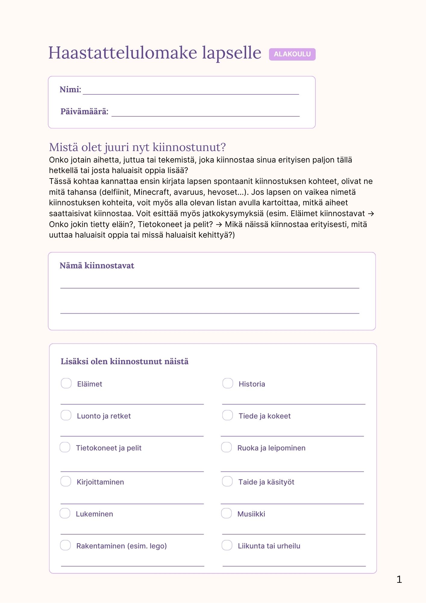 Tämä kolmesivuinen lomake on suunniteltu alakouluikäisten lasten kanssa käytettäväksi. Lomakkeen saat luotua yhteyttä lapseen ja voitte yhdessä kartoittaa hänen kiinnostuksenkohteitaan, tavoitteitaan ja toiveita oppimisen ja arjen suhteen.