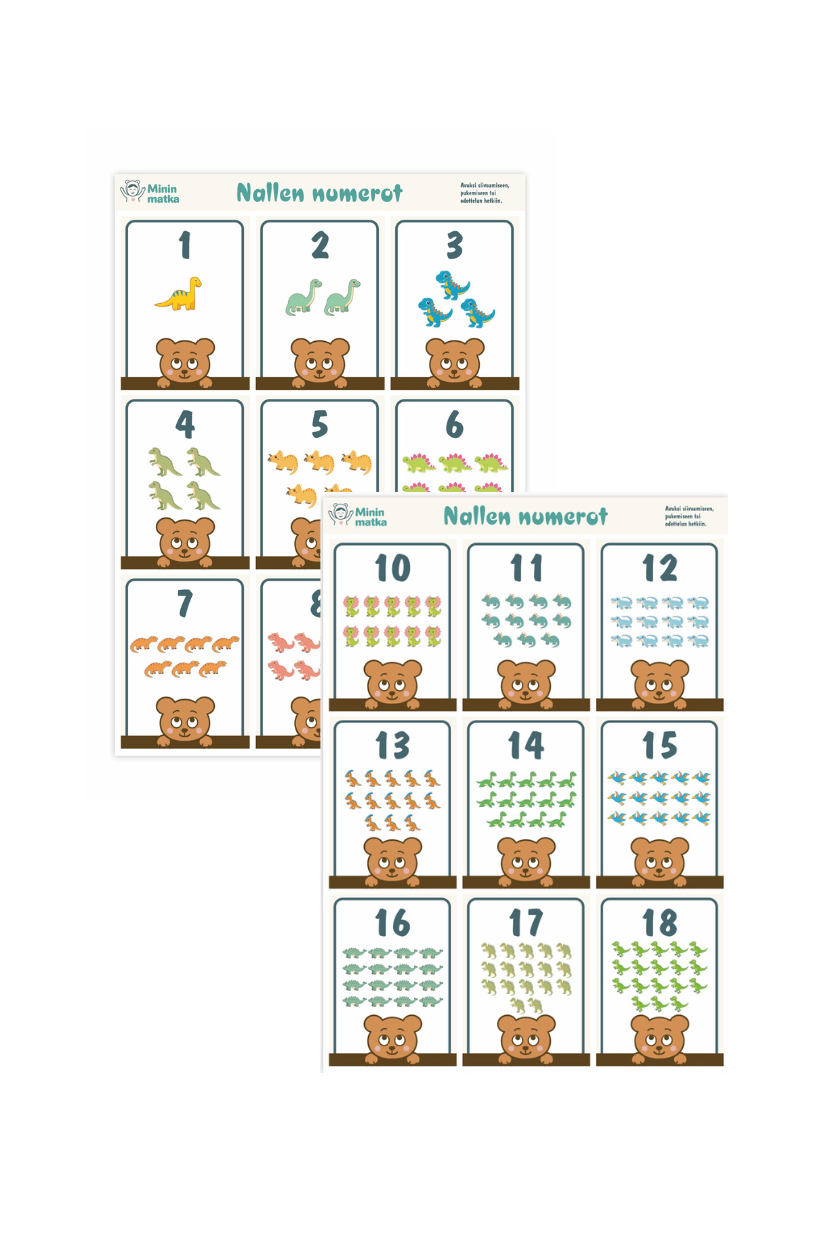 Tuote sisältää yhden A4-kokoisen pdf-tiedoston, jossa on kaksi sivua. Saat tuotteen heti oston jälkeen sähköpostiisi. Korteissa on numerot 1-18. Tulosta arkit, leikkaa (tai anna lapsen leikata) ja ota käyttöön. Laminointi tekee korteista kestävämmät.