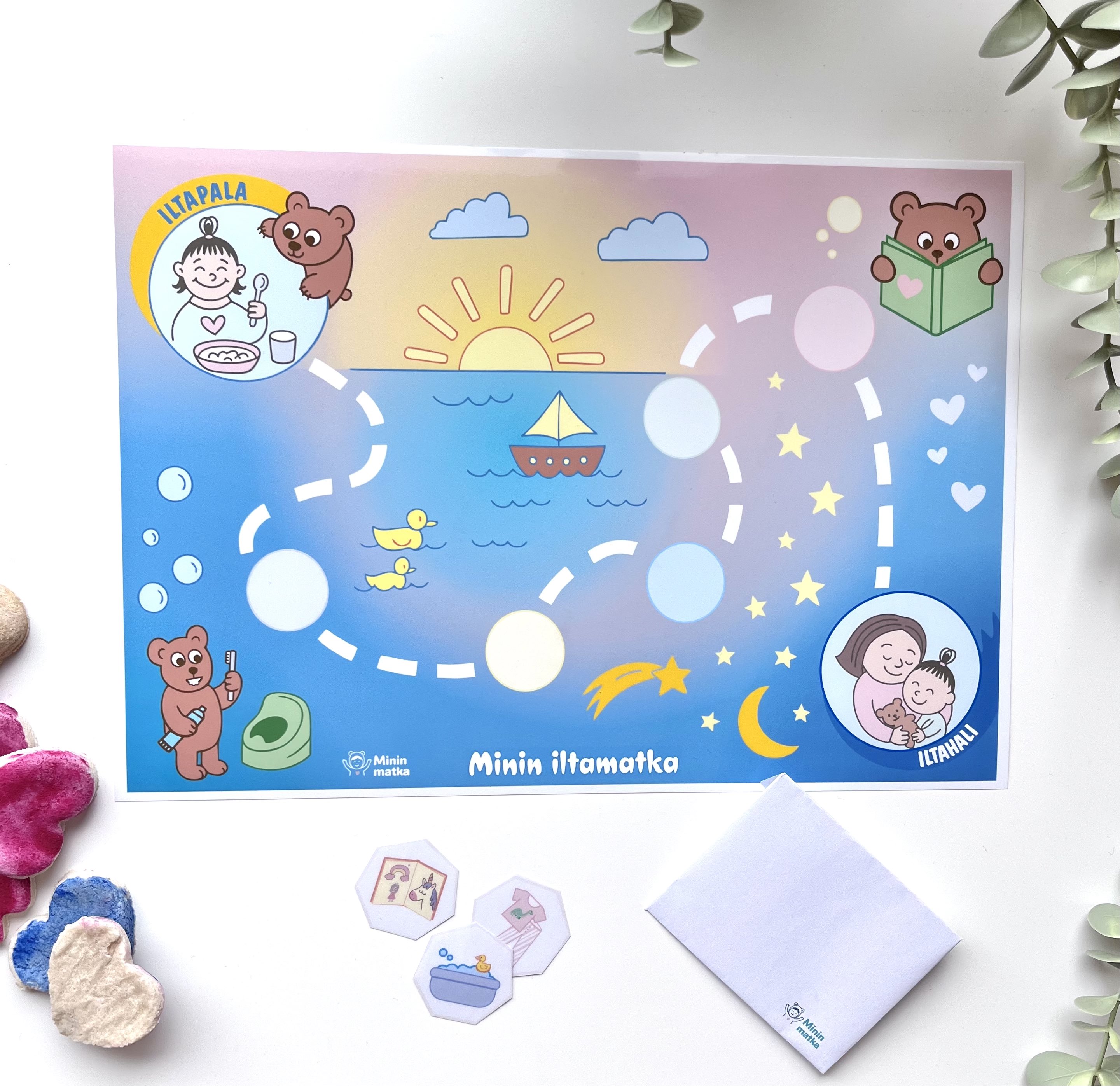 Kotiin postitettava tuote iltatoimien helpottamiseksi. Pakettiin sisältyy A4-kokoinen iltatoimien kartta sekä 10 pientä kuvaa iltatoimista, joista voi valita lapselle sopivat ja asetella haluamaansa järjestykseen kartalle. Kartta auttaa lasta hahmottamaan ruutineja, mutta tuo samalla vaikutusmahdollisuuksia illan kulkuun. Minkä värinen potan kuva tänä iltana? Pestäänkö ensin hampaat vai vaihdetaanko yöpaita?
