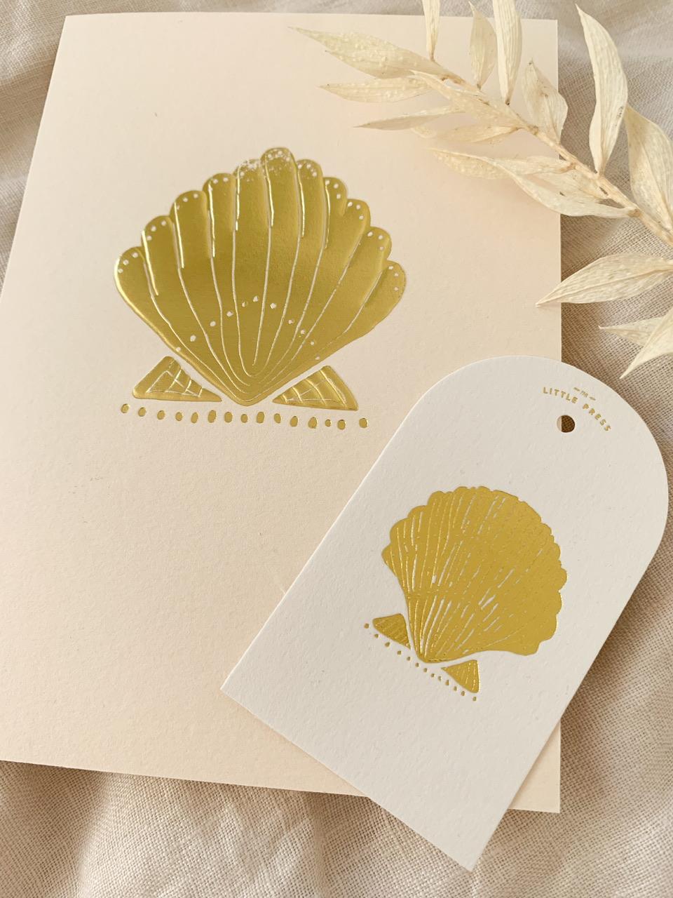 kultafolioitu simpukka-kuvio on etupuolella. pakkaus sisältää kuusi korttia. yhden kortin koko on noin 5 cm x 7,5 cm.