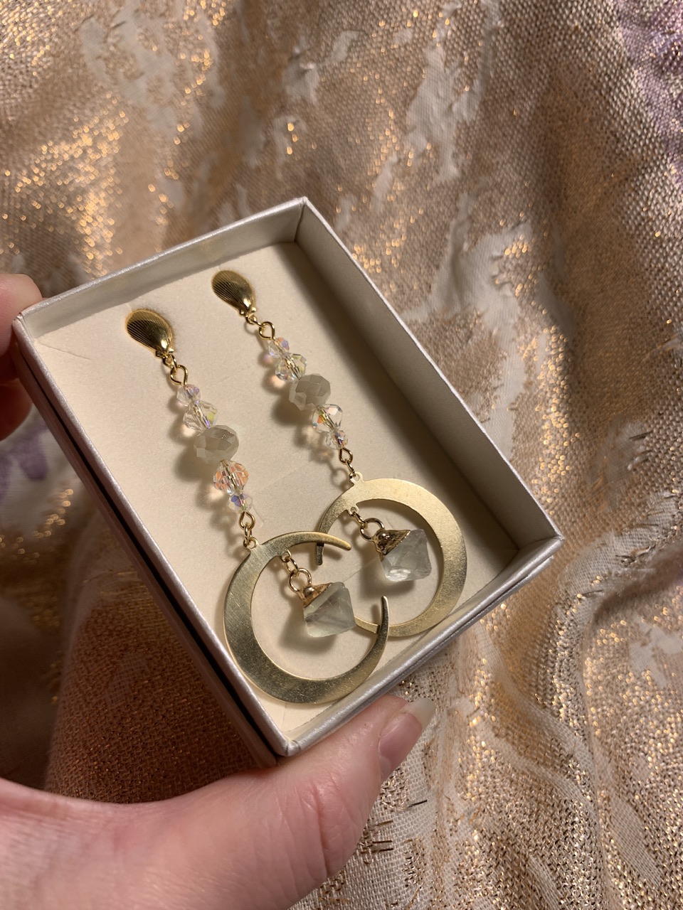näyttävissä korvakoruissa erilaisia secondhand-lasihelmiä, messinkiset kuunsirpit sekä fluoriitti-timantit.