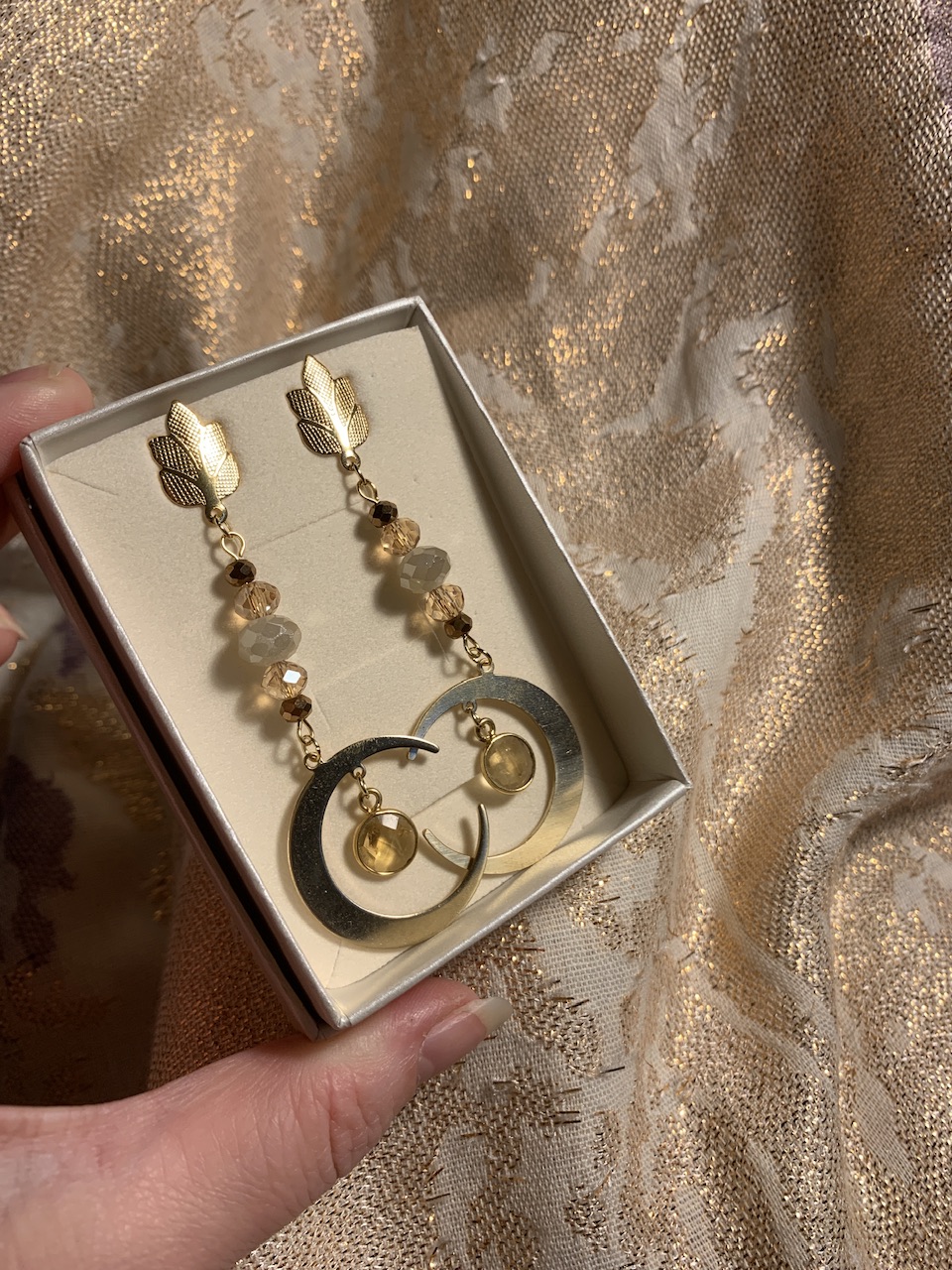 näyttävissä korvakoruissa erilaisia secondhand-lasihelmiä, messinkiset kuunsirpit sekä yksilölliset hunajaisen sävyiset sitriinit.