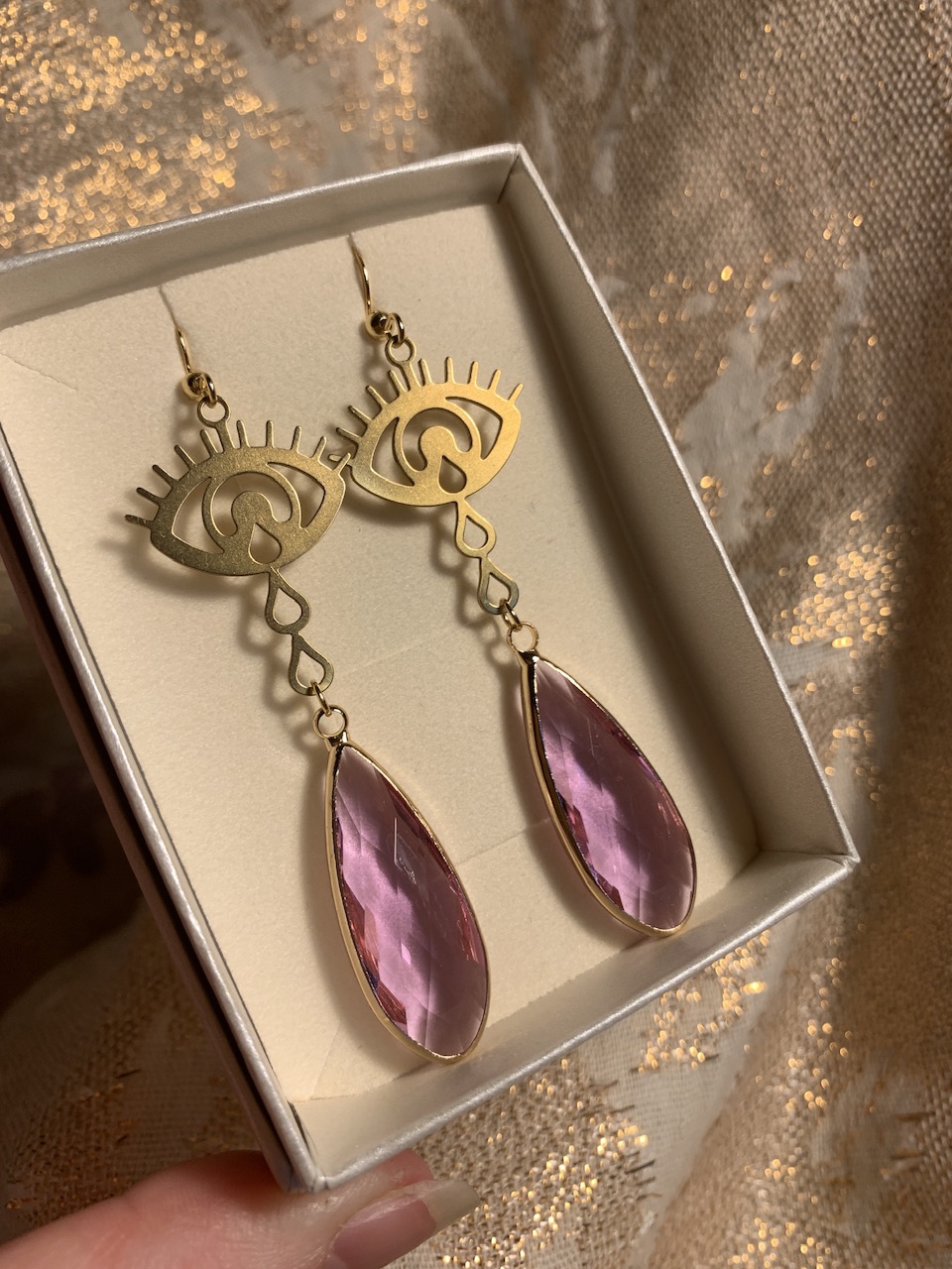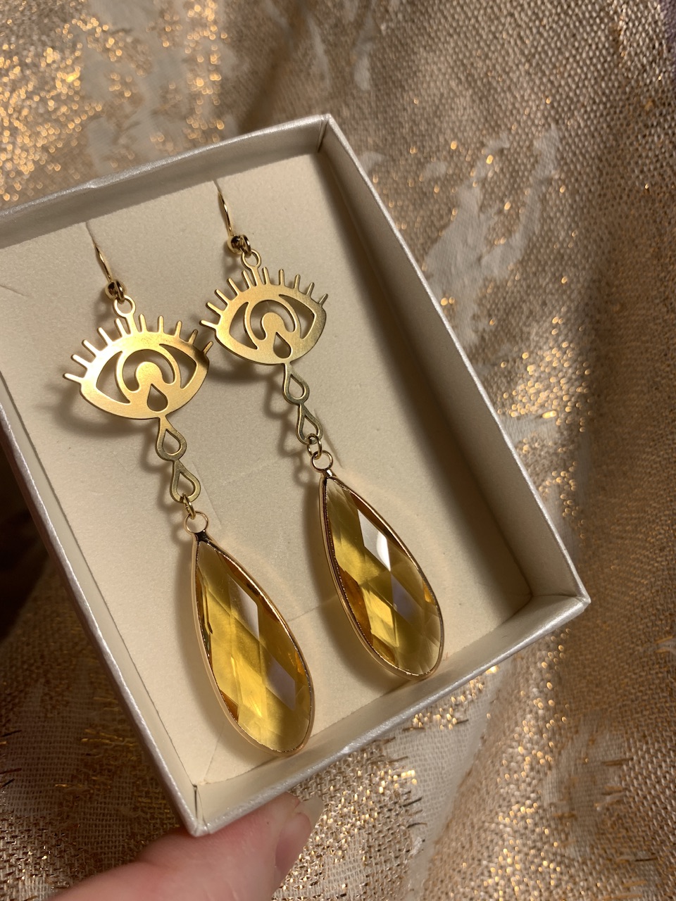 korvakoruissa valitsemasi lasipisara (topaasi, savukvartsi, laventeli) ja messinkinen iso kyynelsilmä.