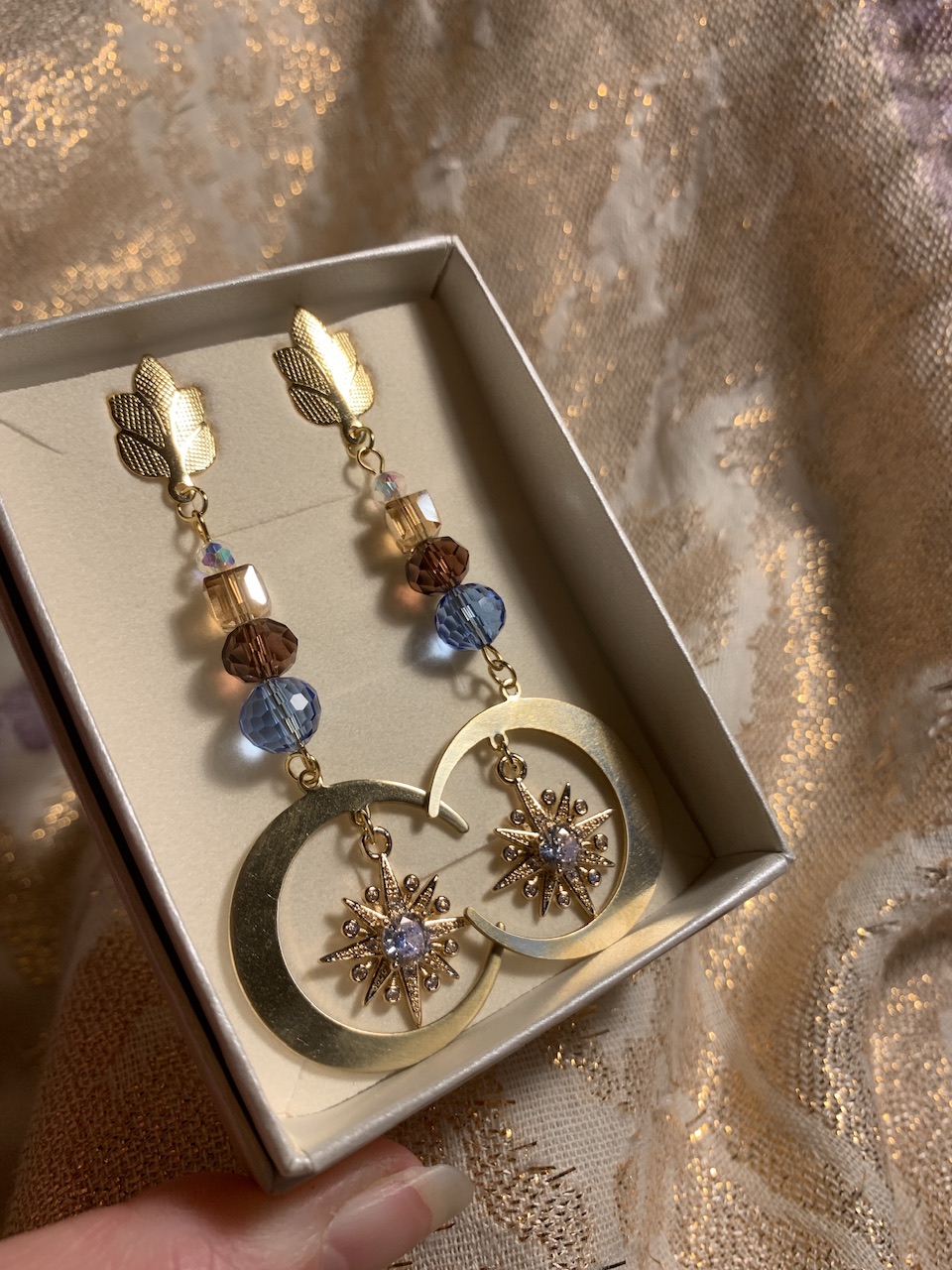 näyttävissä korvakoruissa erilaisia secondhand-lasihelmiä, messinkiset kuunsirpit sekä pohjantähti-strassiriipukset.