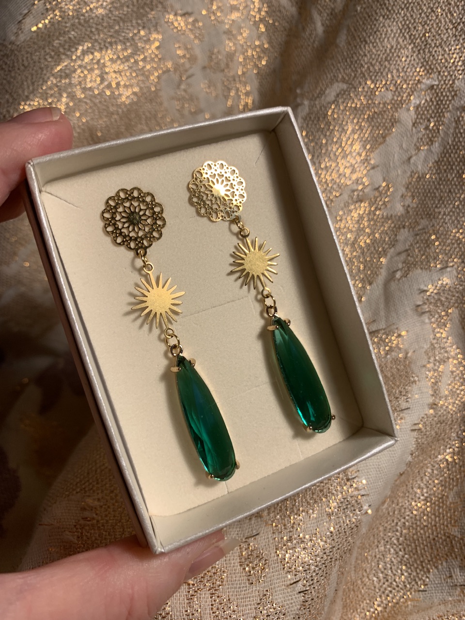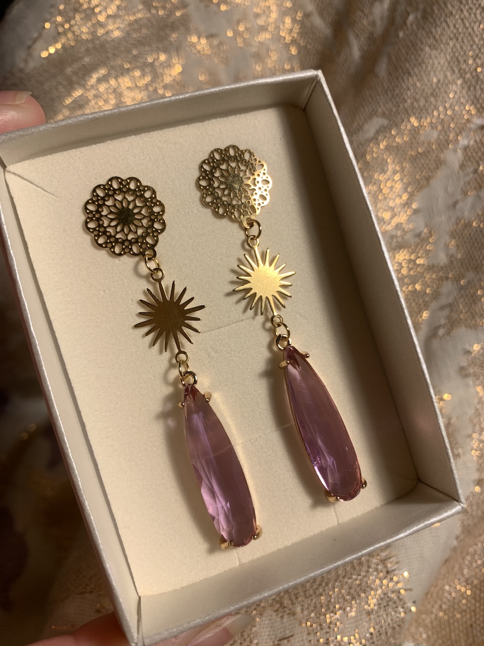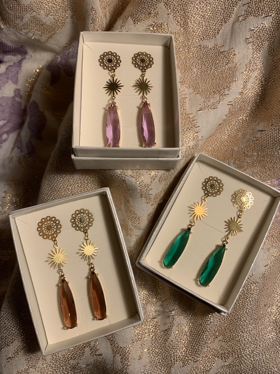 korvakoruissa toiveen mukainen lasinen pisara, jonka sävyvaihtoehtoina laventeli, smaragdi tai savukvartsi, sekä messinkiset pienet auringot.