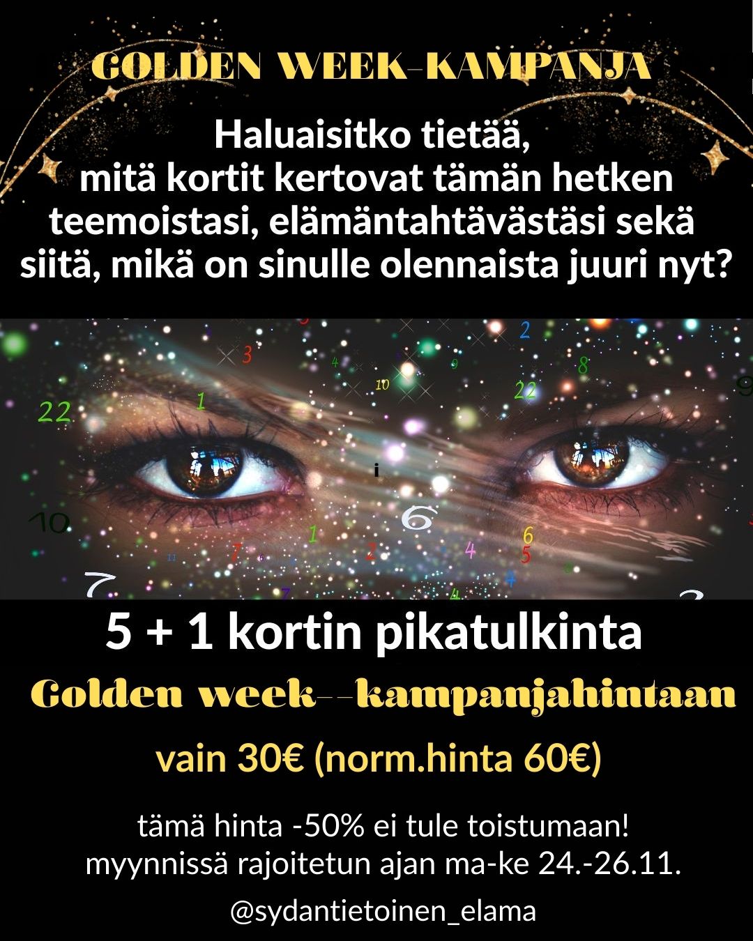 Tilaa nyt 5 +1 kortin tulkinta, saat noin 3 vuorokauden kuluessa tilauksestasi s-postiisi suomenkielisen kirjallisen tulkinnan sekä korttien kuvat. Tulkintaa varten otan sinuun energeettisen yhteyden ja opastuksessa, sekä oppaiden että intuition ohjaamana, nostan sinulle kortit ja kirjoitan esiin nousseista teemoista. Ps. En ennusta tulevaa, vaan kortit kertovat sen, mikä on sinulle olennaista nyt. Korttitarjous myynnissä vain rajoitetun ajan MA-KE 24.-26.11.2025 vain 30€ (norm. hinta 60€), tämä -50% hinta ei tule koskaan toistumaan!vbOostolinkki kommenteissa.