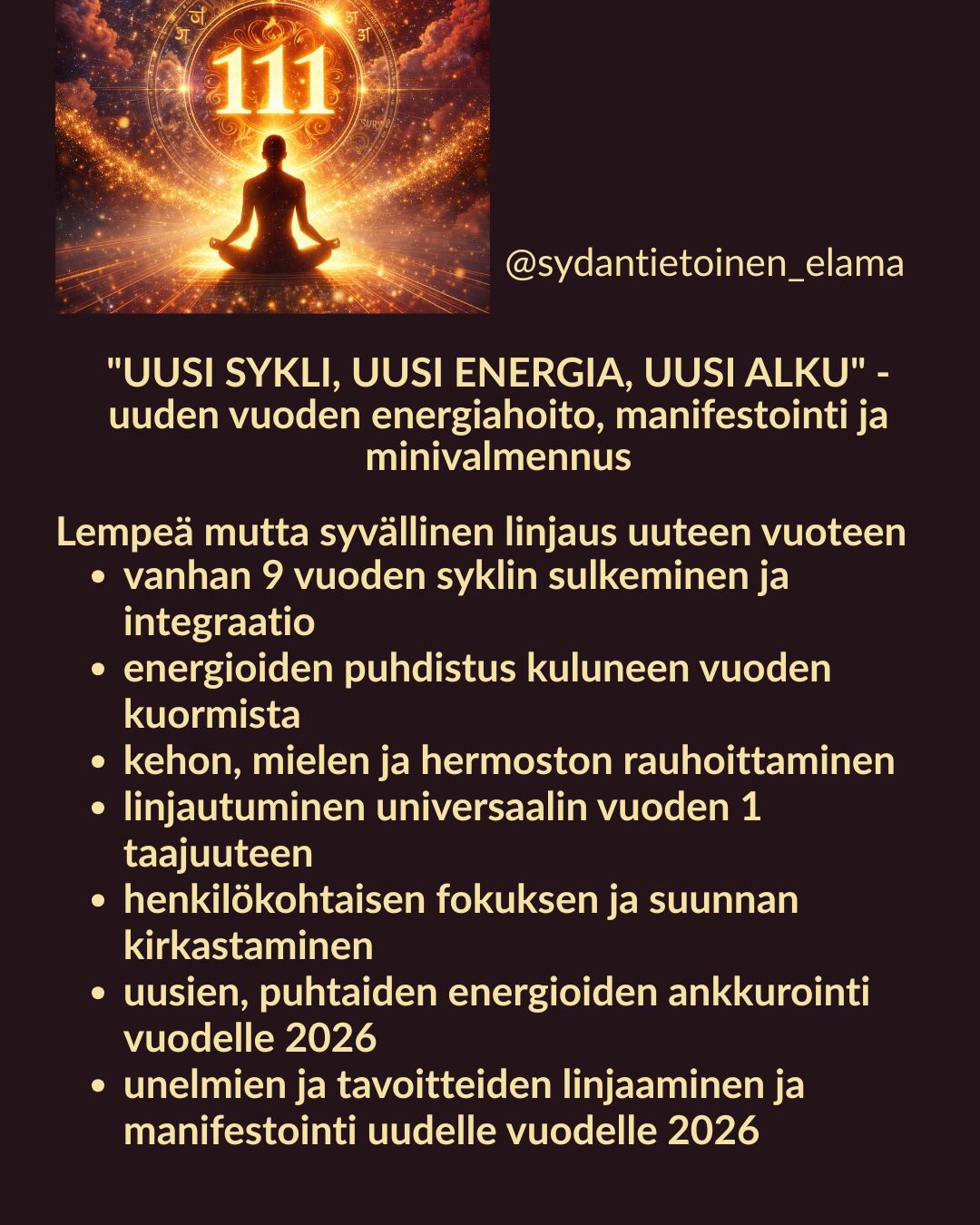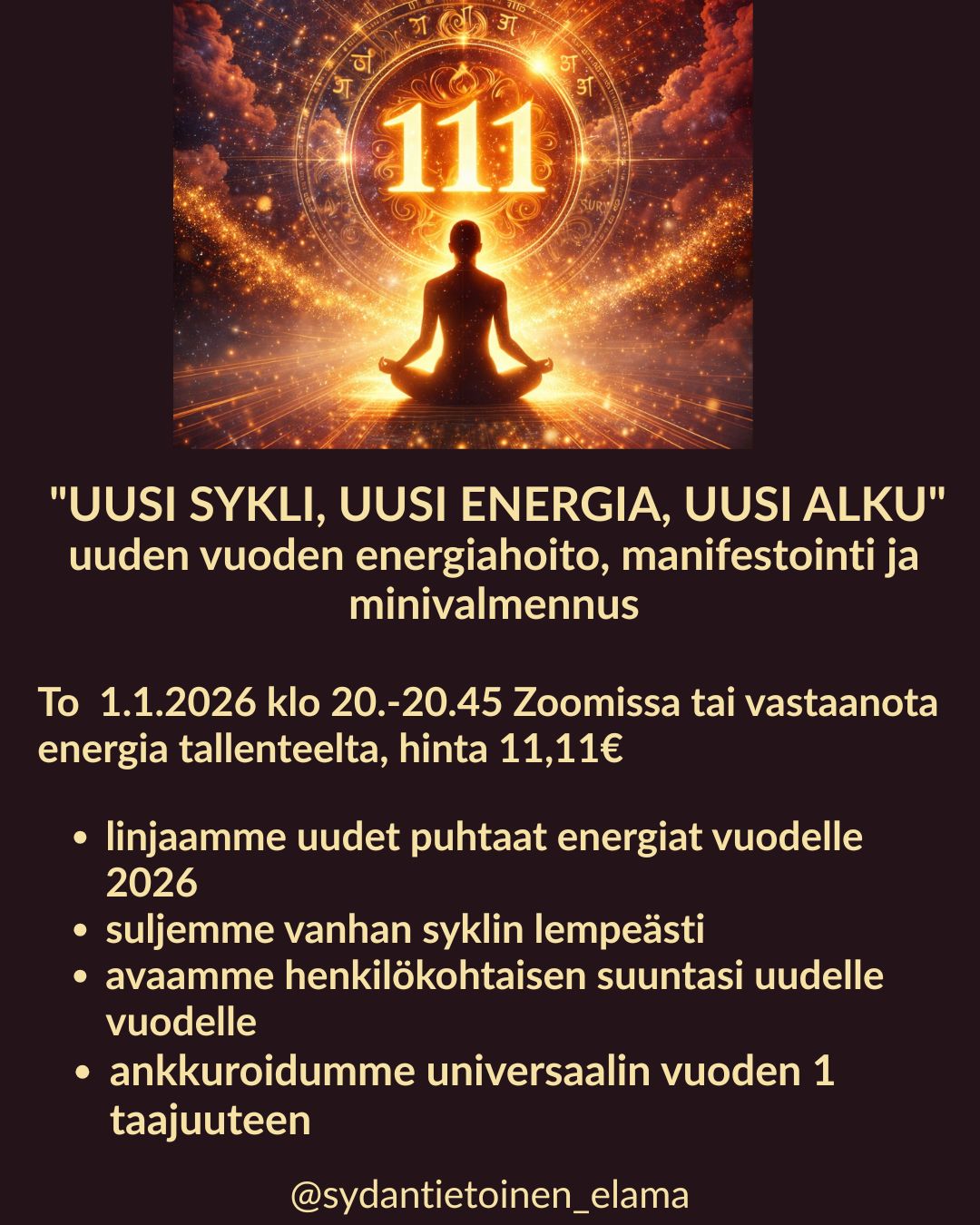 111-PORTAALI & VUODEN ALOITUS: "UUSI SYKLI, UUSI ENERGIA, UUSI ALKU" - uuden vuoden energiahoito, manifestointi ja minivalmennus