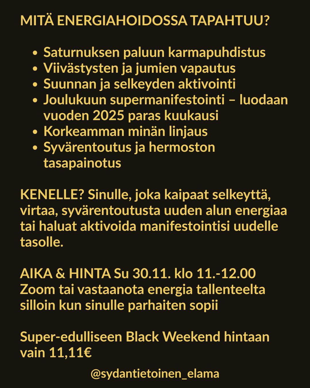 Saturnus, ns. Karman Lordi, ryhtyi etenemään pe 28.11. tuoden karmisen puhdistuksen ja sisäisten oppien päätöksen. Sunnuntaina aamupäivällä 30.11. kokoonnumme vahvaan energiaan vapauttamaan vuoden raskaimmat teemat ja manifestoimaan uuden suunnan.