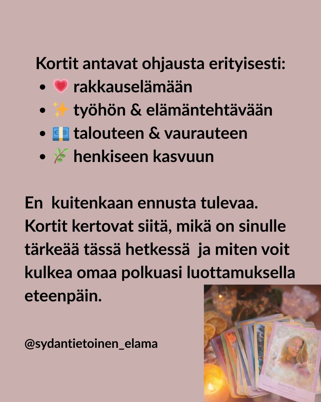 Kortit eivät ennusta tulevaa – ne nostavat esiin sen, mikä on sinulle olennaista juuri nyt ja tukee sinua omalla polullasi 💫