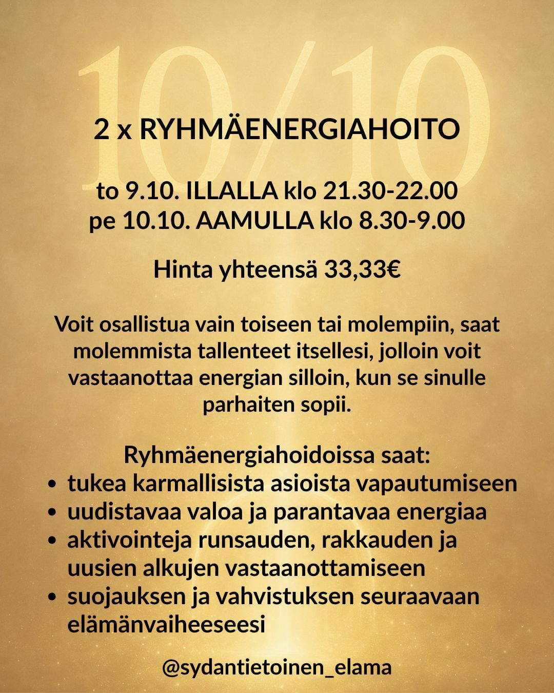 Voit myös osallistua 10/10-portaalin energiahoitoihin, tällä kertaa saat yhdellä maksulla KAKSI energiahoitoa!