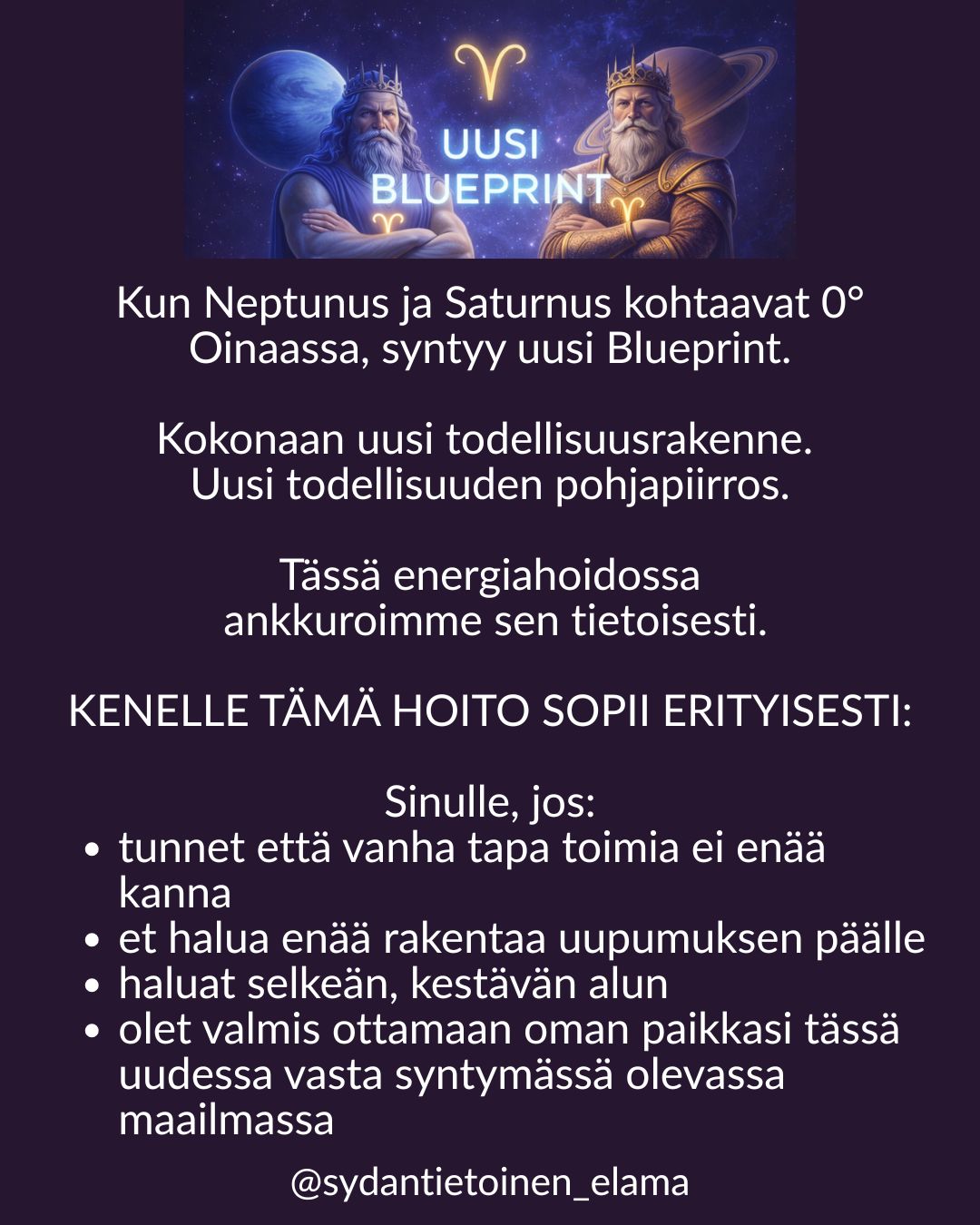 Kun Neptunus ja Saturnus kohtaavat 0° Oinaassa, syntyy uusi Blueprint – uusi todellisuuden pohjapiirros, kokonaan uusi pohjarakenne.