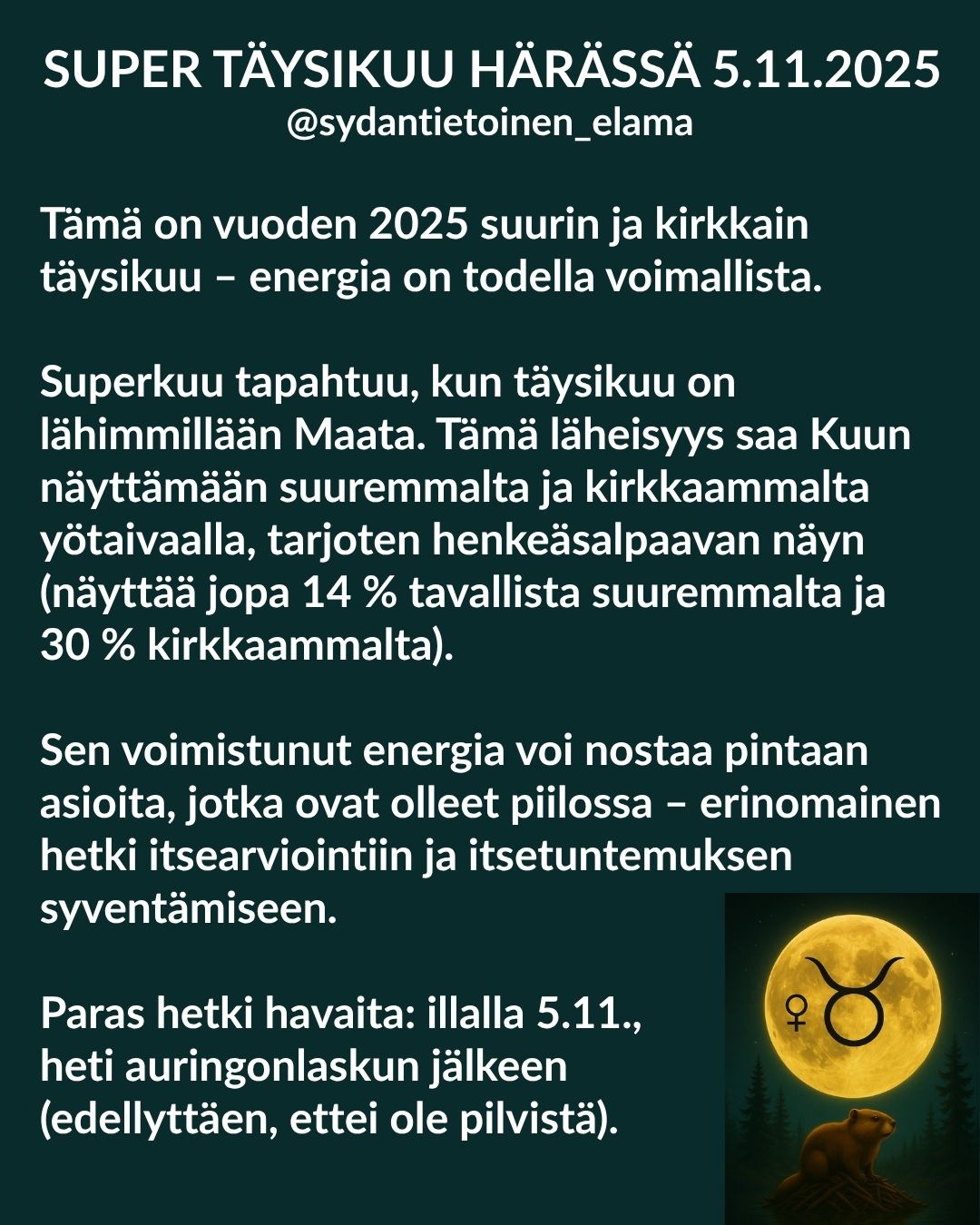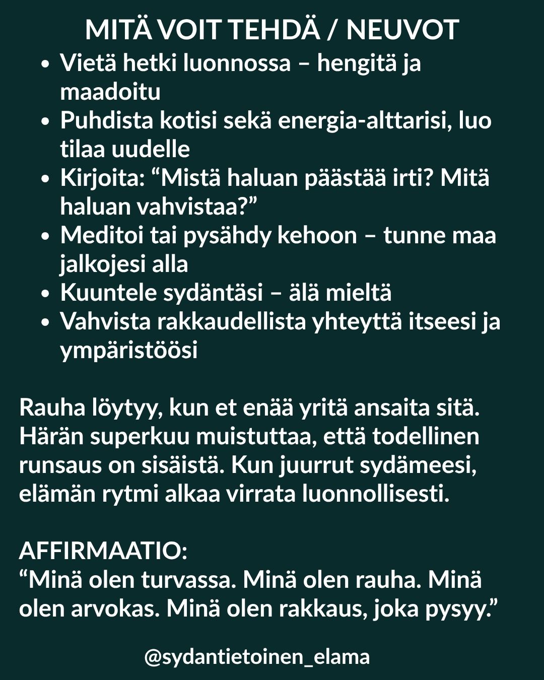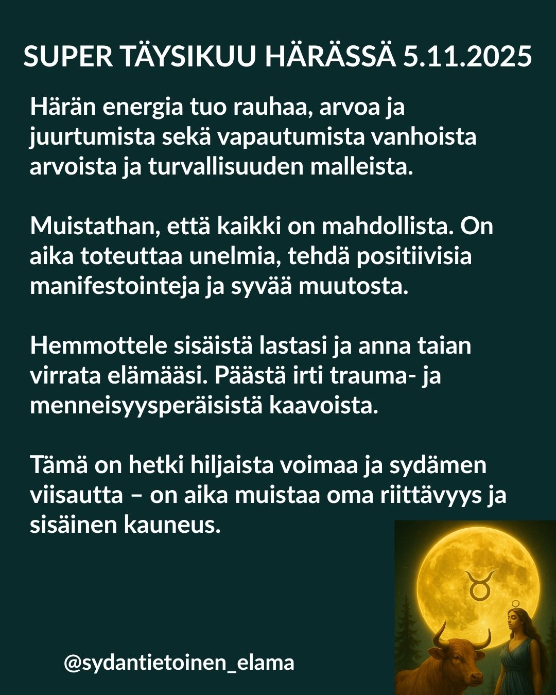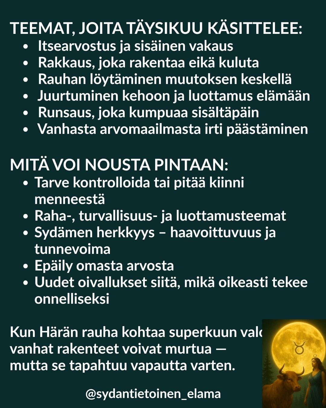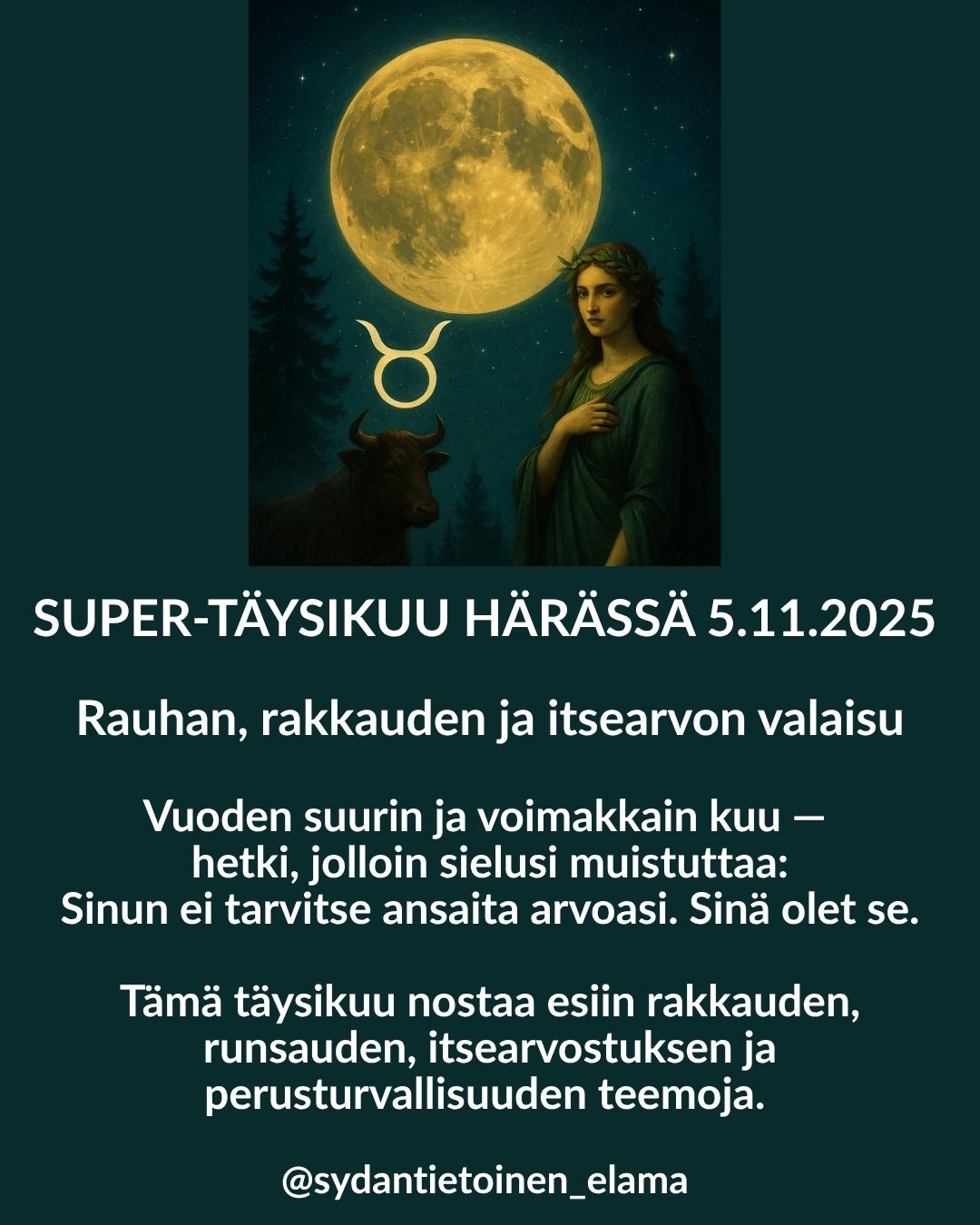 Rauha löytyy, kun et enää yritä ansaita sitä. Härän superkuu muistuttaa, että todellinen runsaus on sisäistä. Kun juurrut sydämeesi, elämän rytmi alkaa virrata luonnollisesti.
