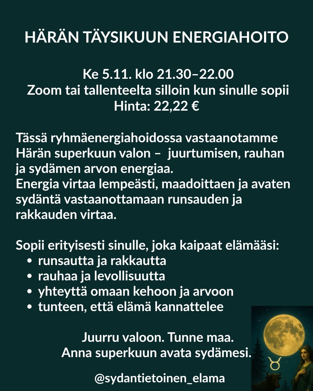 Voit myös osallistua Härän täysikuun energiahoitoon tallenteelta silloin kun sinulle sopii Hinta: 22,22 €