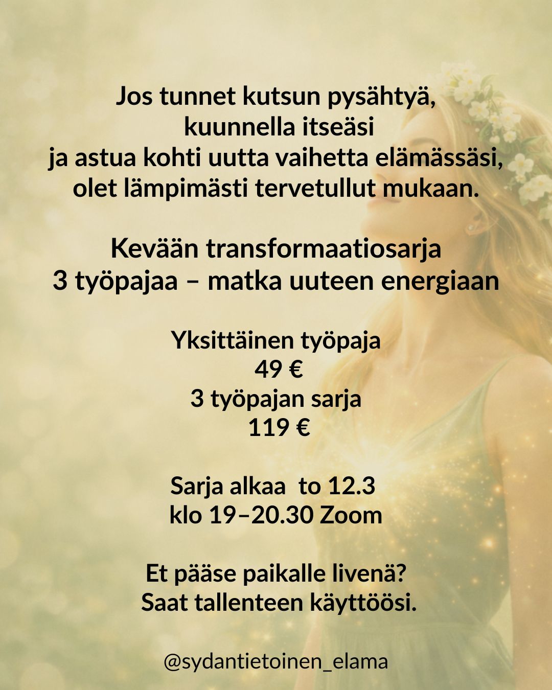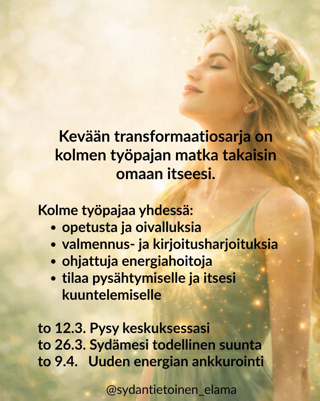 Kevään transformaatiosarja on kolmen työpajan kokonaisuus, jossa pysähdymme rauhoittumaan, kuuntelemaan itseämme ja vahvistamaan yhteyttä omaan sisäiseen suuntaamme.