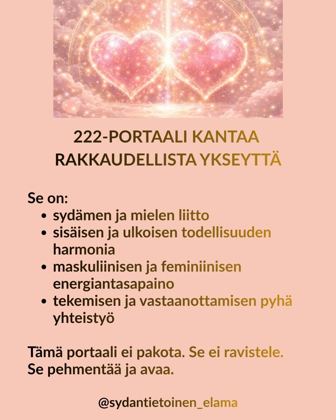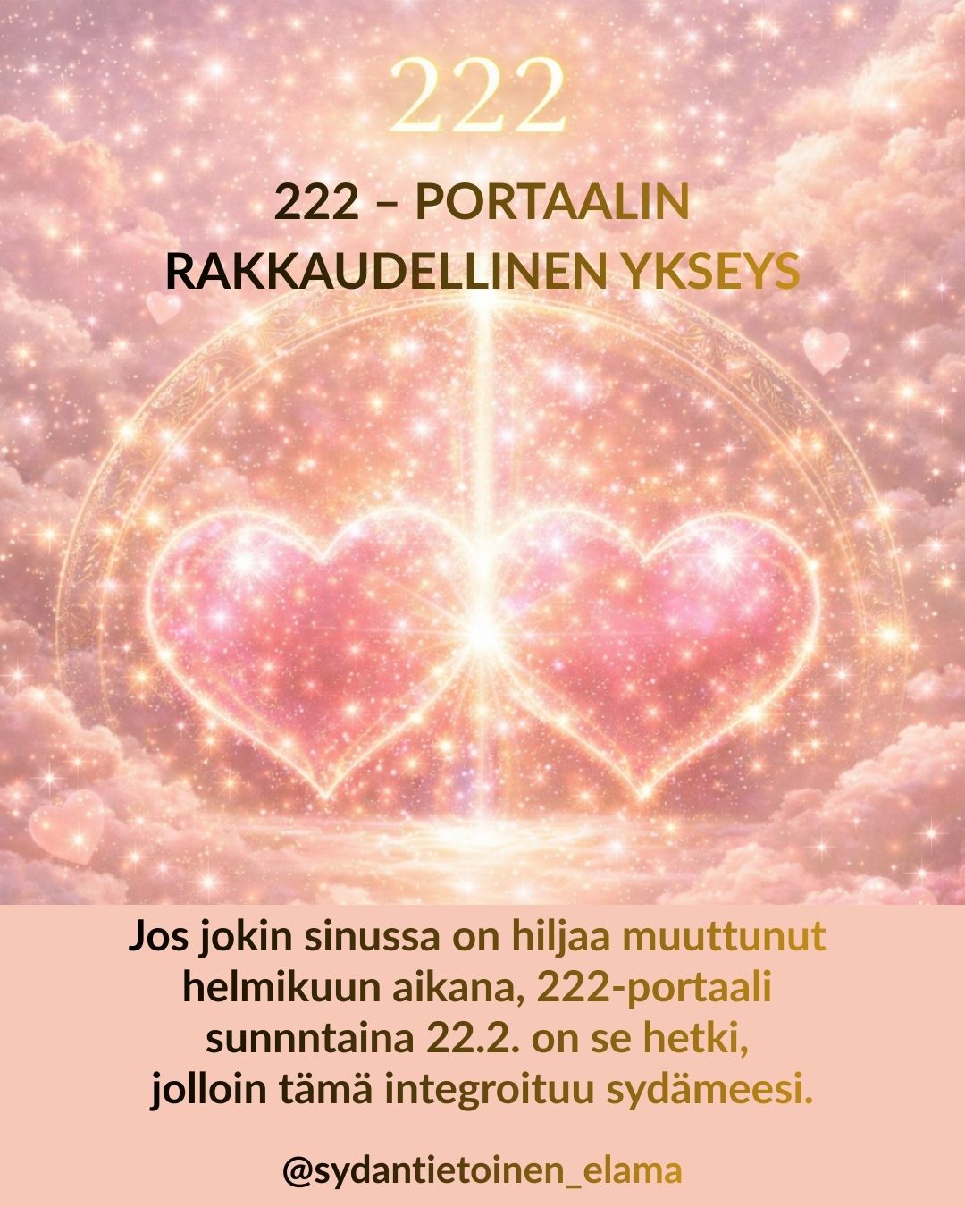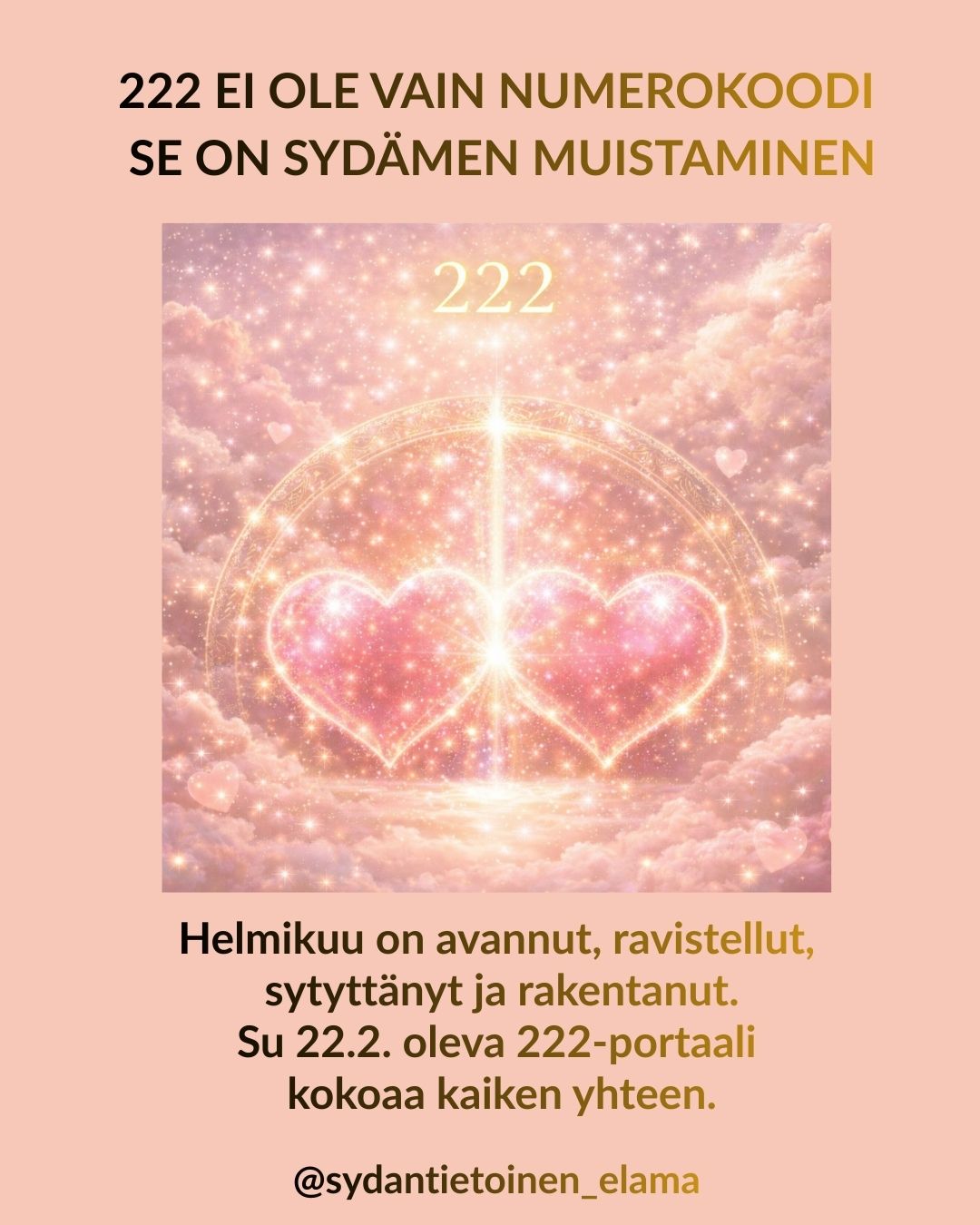 222 ei ole vain numerokoodi. Se on sydämen muistaminen. Helmikuu on avannut, ravistellut, sytyttänyt ja rakentanut. Nyt 22.2. kokoaa kaiken yhteen. 222 kantaa rakkaudellista ykseyttä.
