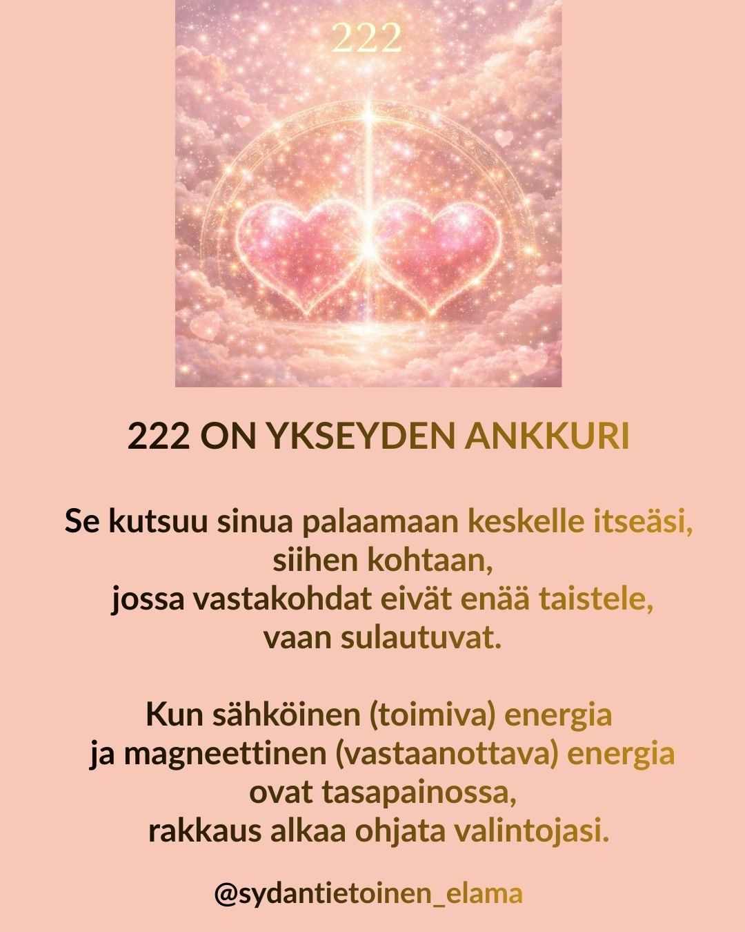 Se kutsuu sinua palaamaan keskelle itseäsi — siihen kohtaan, jossa vastakohdat eivät enää taistele, vaan sulautuvat. Kun sähköinen (toimiva, eteenpäin vievä) energia ja magneettinen (vastaanottava, luottava) energia ovat tasapainossa — rakkaus alkaa ohjata valintojasi. 222 on ykseyden ankkuri.