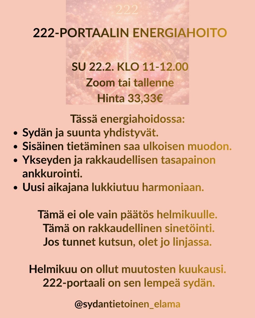222-portaalin energiahoito päättää 4 energiahoidon portaalisarjan. Voit vielä ostaa 4 energiahoidon portaalisarjan pakettihintaan 88,88€. Saat 3 ensimmäistä energiahoitoa tallenteina sähköpostiisi ja tähän viimeiseen hoitoon voit osallistua liveen tai vastaanottaa energian tallenteelta.