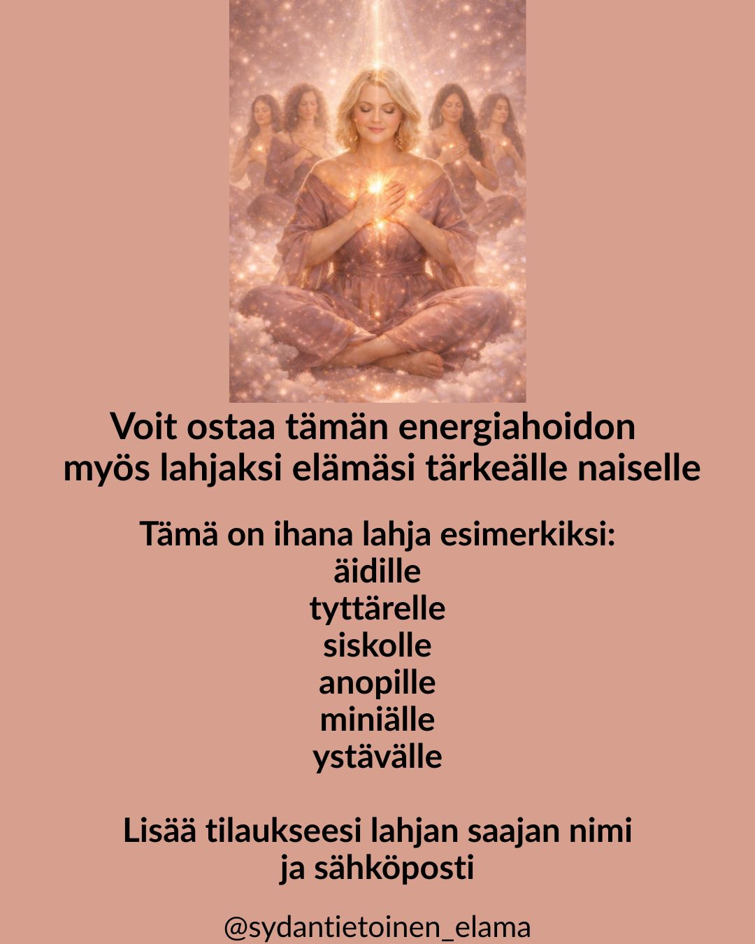 Mikäli ostat hoidon itselle ja lahjaksi, tee tällöin kaksi eri ostoa, ja laita lahjan saajan nimi ja sähköpostiosoite, niin lähetän Zoom-linkin ja tallenteen suoraan hänelle. Voit itse kertoa ostaneesi hänelle tämän hoidon lahjaksi.