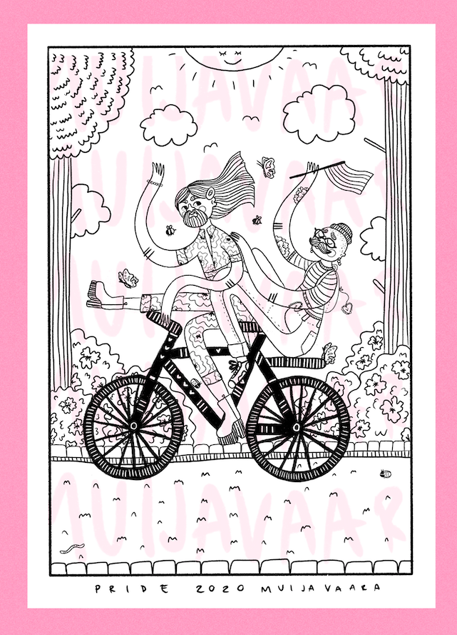 Tiedosto sisältää yhden A4 kokoisen värityskuvan, jonka voi halutessaan tulostaa omaan käyttöön. Valmiit väritykset voi tägätä instagramissa @muijavaara. PRIDE 2020 Venla Vaattovaara