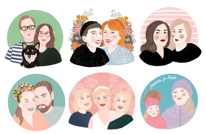 Potrettikuvitus kahdesta henkilöstä. Sisältää A4-kokoisen signeeratun printin valmiista kuvituksesta.