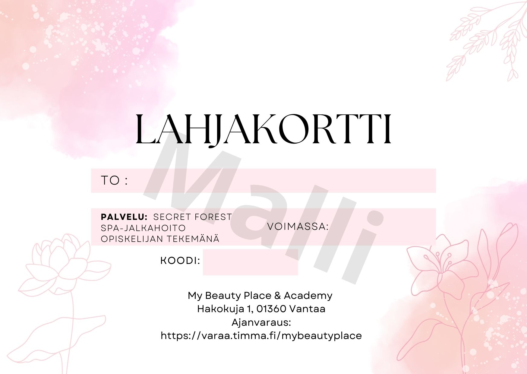 Metsäinen hoitoelämys jaloille opiskelijan tekemänä. Todellinen jalkojen hemmotteluhoito, jossa laadukkaat tuotteet ja hierontatekniikka saavat aikaan taivaallisen kokemuksen. Tuotteet on valmistettu Suomessa ja niissä tuoksuu ihana suomalainen metsä ja raikas piparminttu. Hoito sisältää: jalkojen kylvetys, kynsinauhojen hoito, kynsien lyhentäminen ja jalkojen kosteutus. Tämän lisäksi kuorinta sääreen asti, virkistävä piparminttu-jalkanaamio ja verenkiertoa elvyttävä rentoutushieronta koko jalkaterään ja sääreen. Todellinen stressinlievityshoito, joka vie sinut retkelle kotimaiseen metsään. Hoito on hemmotteluhoito, jossa ei tehdä kovettumien tai känsien poistoa terällä tai ohenneta poralla kynsiä.
