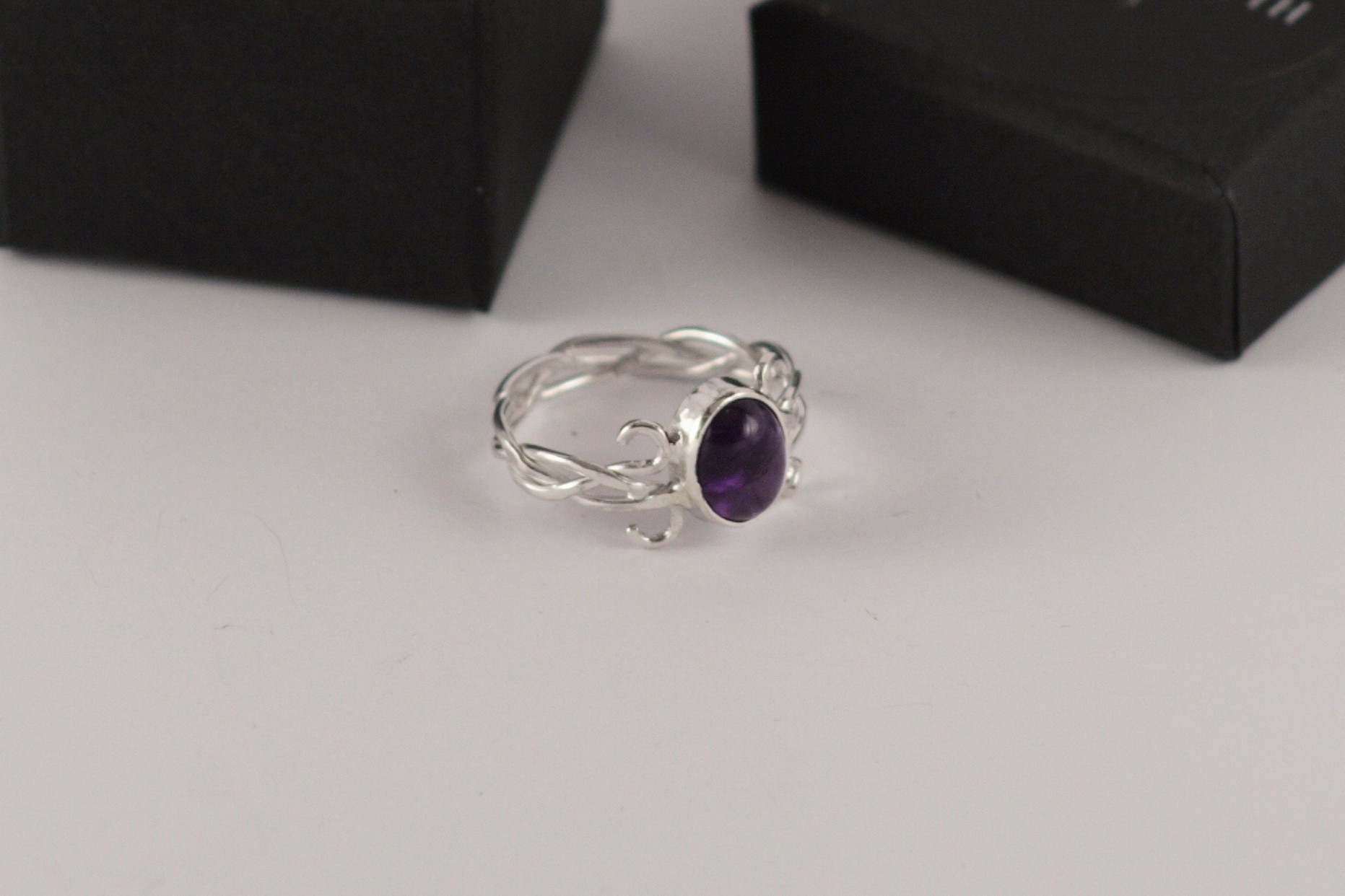 Tämän käsityönä valmistetun kevyen sormuksen runko on punottu hopealangasta ja sormusta koristaa tummanvioletti cabochon ametisti (8 x 10 mm).