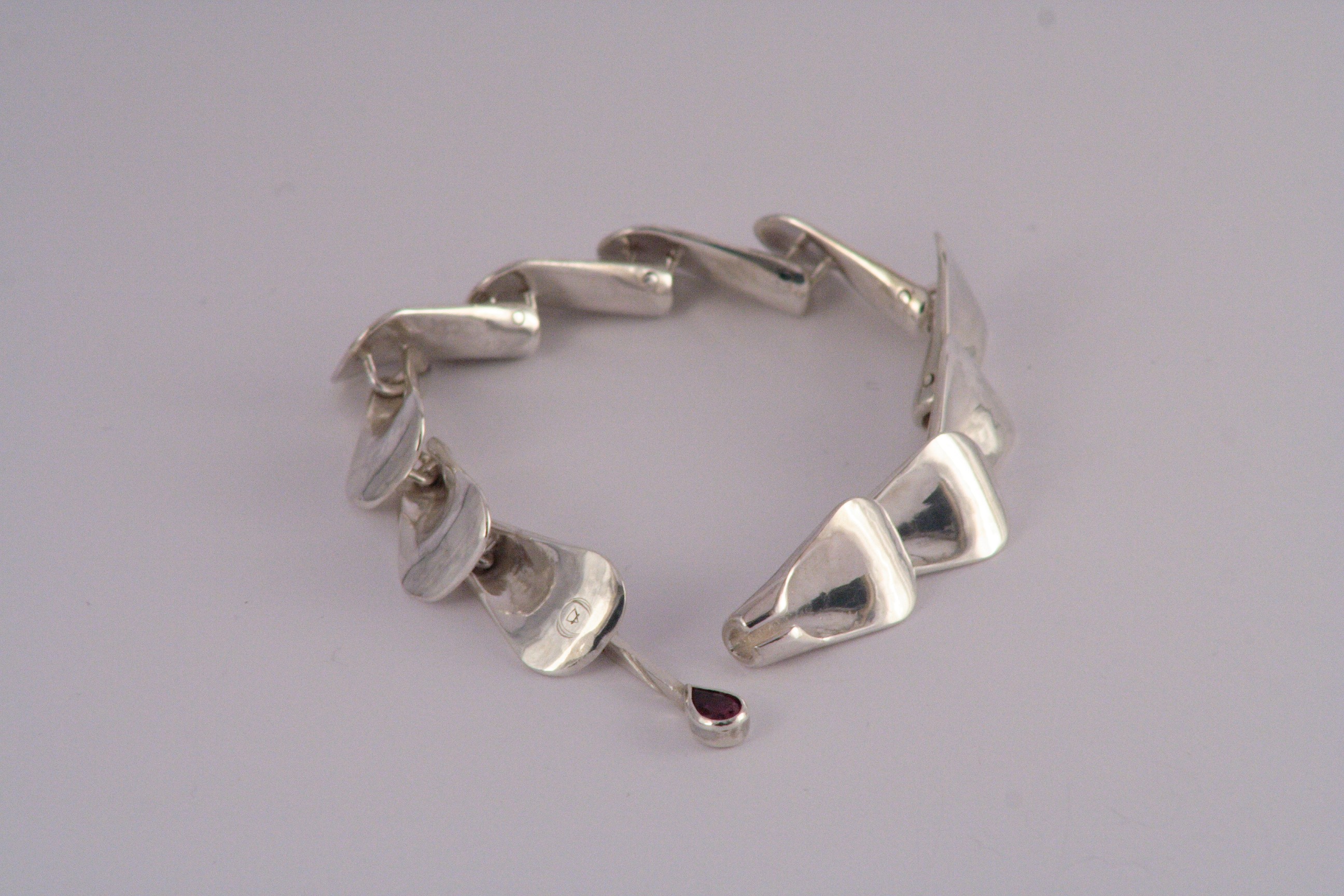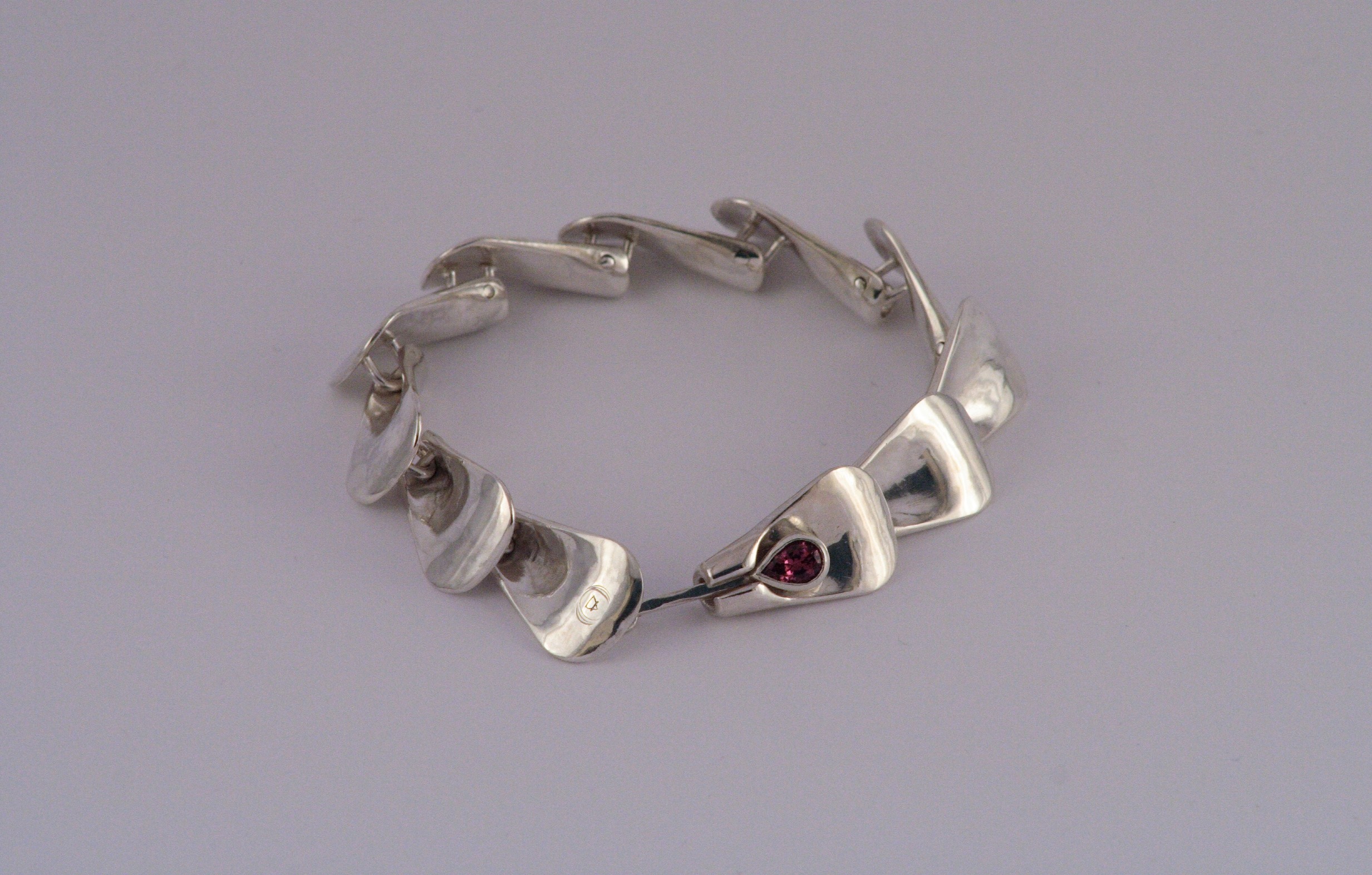 Tämä rannekoru on valmistetaan käsityönä asiakkaan mittojen mukaan (korun sisältämien terälehtien määrä riippuu ranteen ympärysmitasta). Korussa toistuva terälehti on valmistettu käyttämällä vahavalutekniikkaa. Korun lukko valmistetaan aina erikseen ja se on mahdollista saada joko kivellä tai ilman. Kuvan korussa on yksi pisaranmuotoinen, fasettihiottu rodoliittigranaatti (0,5 ct).