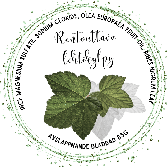 Epsom-suolaa ja mustaherukan lehtiä sisältävä rentouttava kylpysuolaseos. Tässä tuotteessa on käytetty öljyuutoksessa olleita mustaherukan lehtiä. Mustaherukan lehdissä jäljellä olevat vesiliukoiset aktiiviaineet matkaavat osaksi jalkakylpyä!