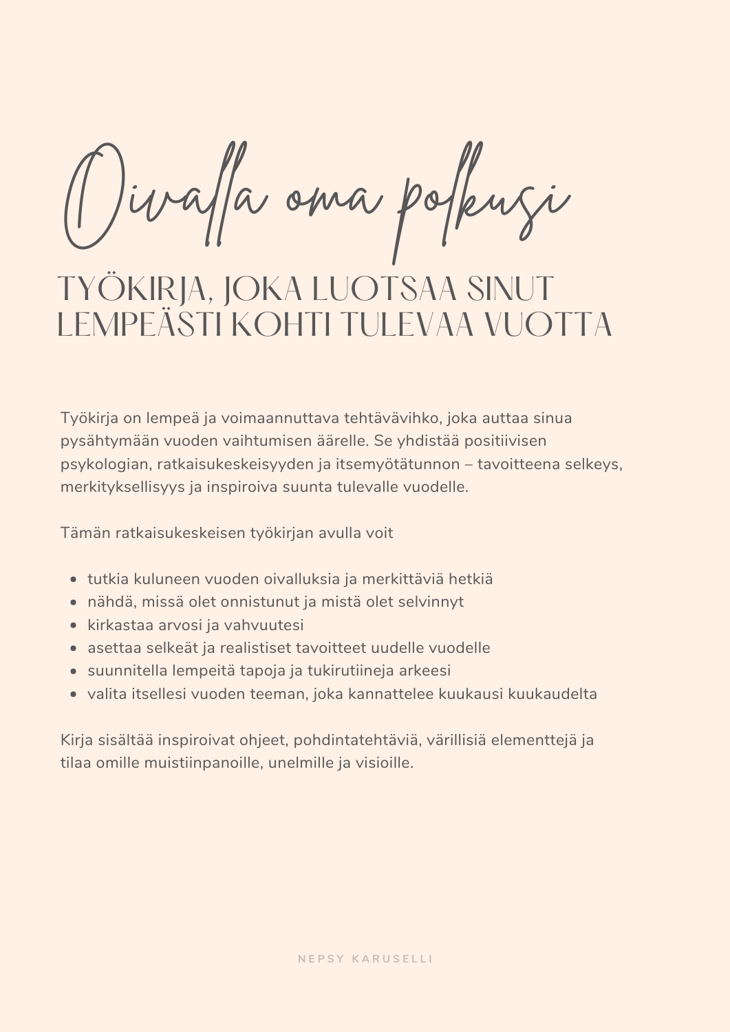 Oivalla oma polkusi -työkirja sisältää 40 sivua lempeitä ja voimaannuttavia tehtäviä, jotka auttavat sinua pysähtymään vuoden vaihtumisen äärelle. Se yhdistää positiivisen psykologian, ratkaisukeskeisyyden ja itsemyötätunnon – tavoitteena selkeys, merkityksellisyys ja inspiroiva suunta tulevalle vuodelle.