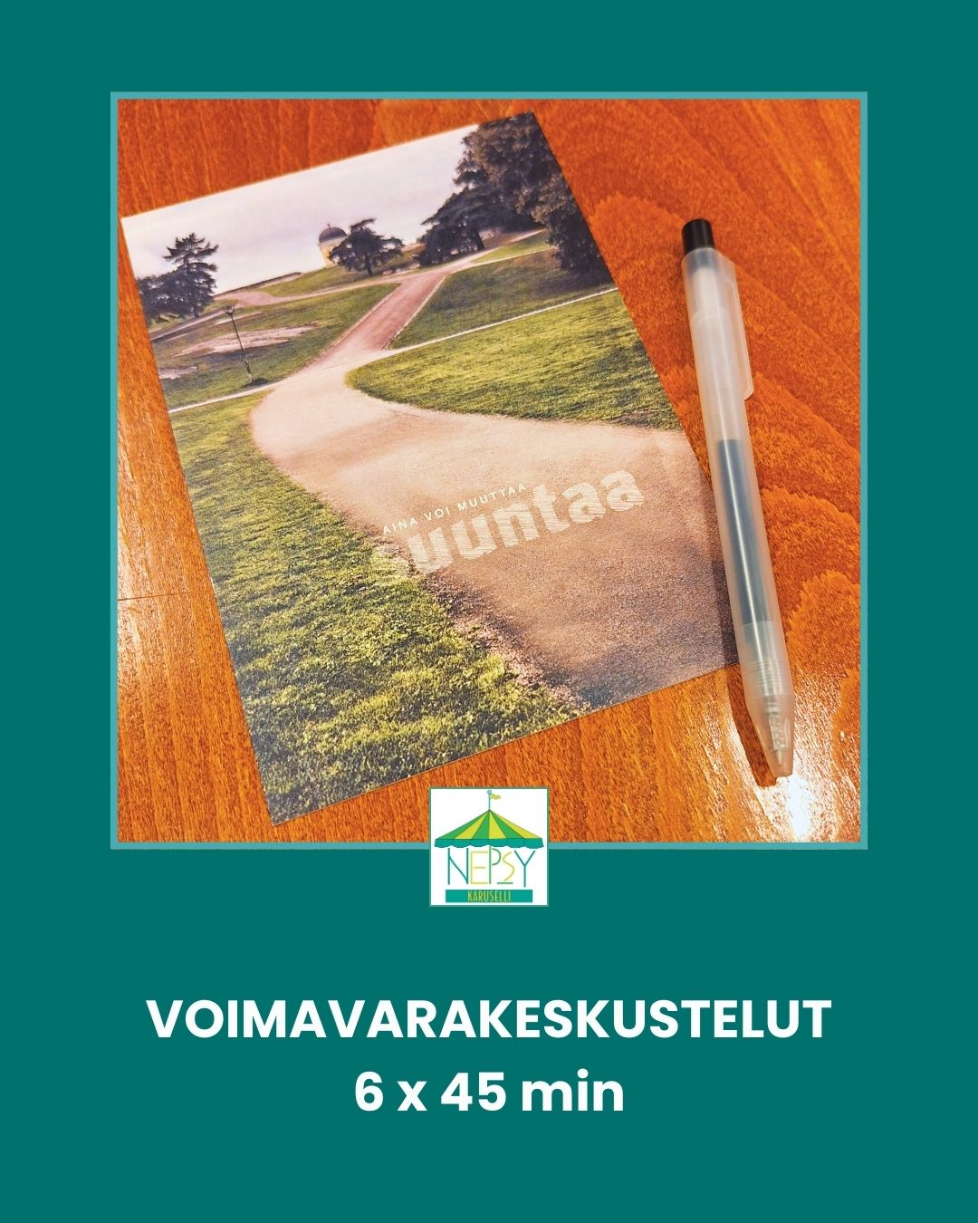 Tapaamiset rakentuvat aina sinun tarpeidesi ja tavoitteidesi ympärille. Työskentelyssä hyödynnetään lempeitä, käytännönläheisiä ja jäsennystä tuovia menetelmiä – tilaa ajatuksille, tilaa hengittää, tilaa olla oma itsesi. Työskentelyssä näkyy Nepsy Karusellin rauhallinen ja lempeä ote: kuljen rinnallasi, kunnes tuuli kääntyy.