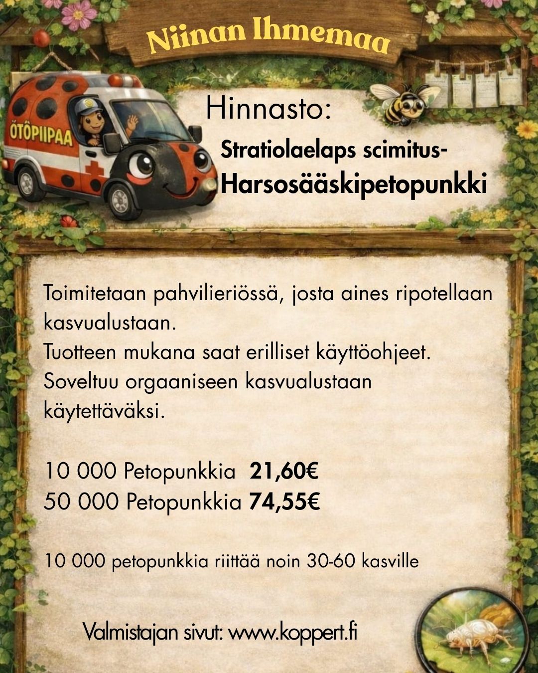 Tuotekuvissa esittely ja hinnasto. Verkkokaupasta tilattavissa ainoastaan 10 000 petopunkin pahvilieriö. Isompi erä tilattava sähköpostilla, niinanihmemaa@gmail.com