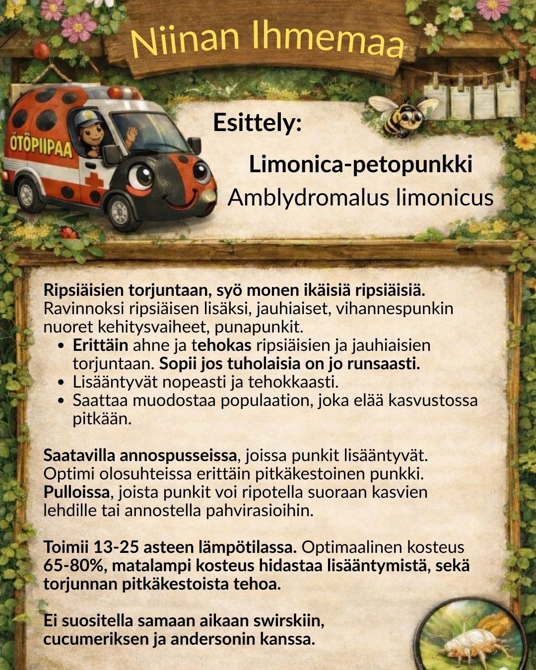 🌿 Miksi Limonica? ❗ Erittäin aktiivinen ja ahne ripsiäisten saalistaja ❗ Lisääntyy kasveilla ja ja pusseissa. Auttaa pitämään tuholaiskannan kurissa