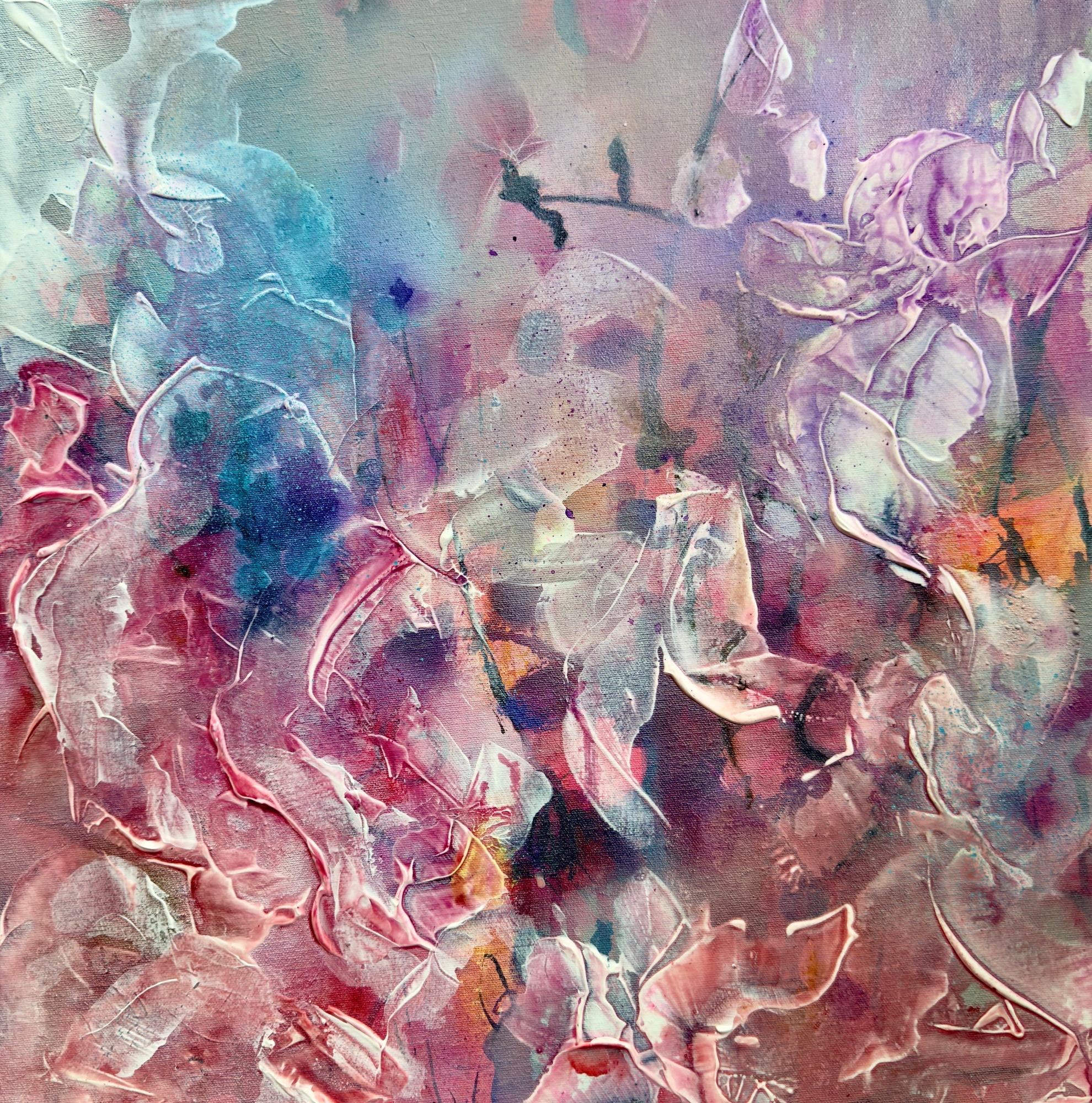Sekatekniikka kankaalle. Mitat: 50 x 50 x 3,7 cm. Valmistunut vuonna 2025. Whisper on maalattu 100% puuvillakankaalle, joka on pingotettu mäntykiilakehykseen. Taulu on ripustusvalmis.