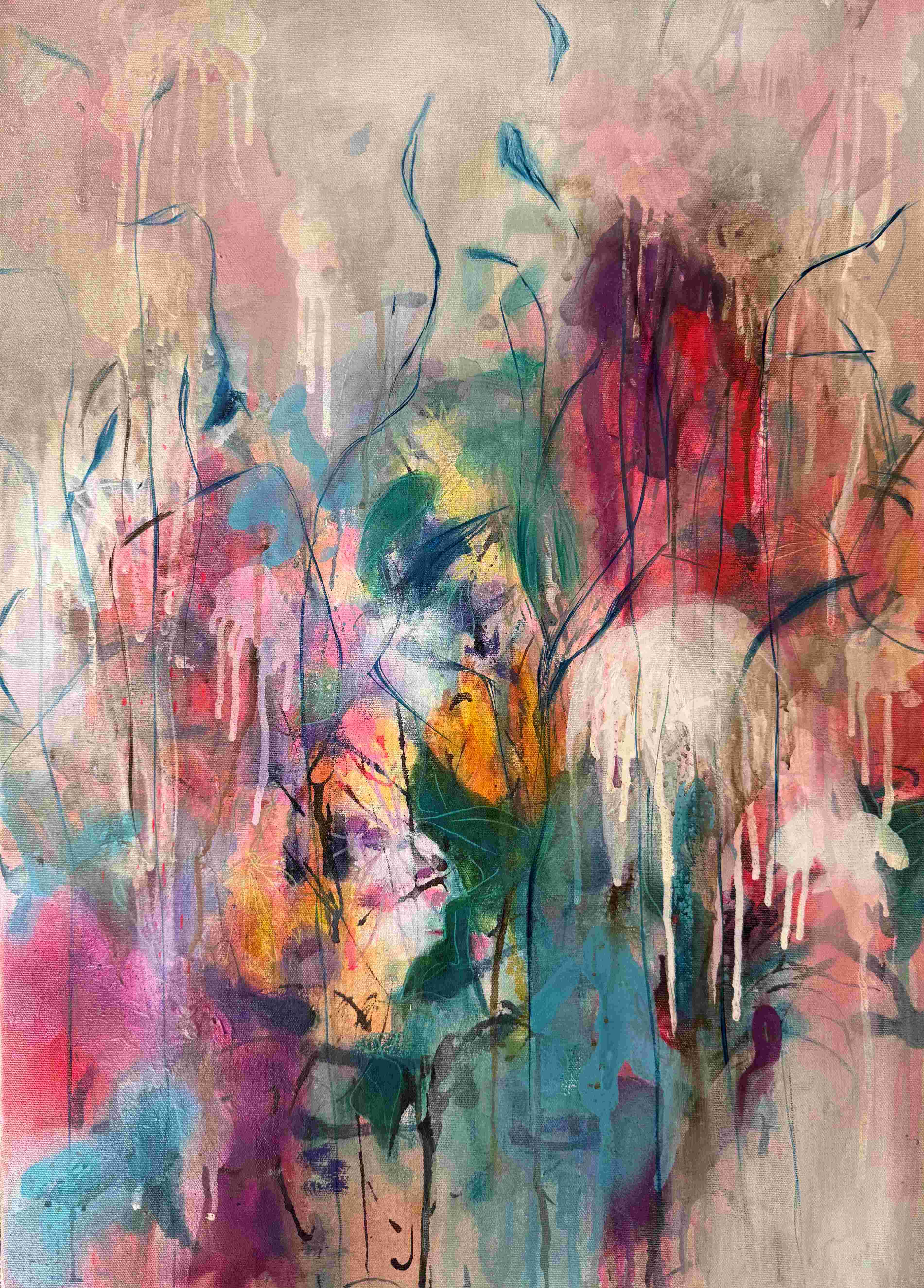 Sekatekniikka ja öljyväri kankaalle. Mitat: 50 x 70 x 3,7 cm. Valmistunut vuonna 2025. Wilted on maalattu 100% puuvillakankaalle, joka on pingotettu mäntykiilakehykseen. Taulu on ripustusvalmis.