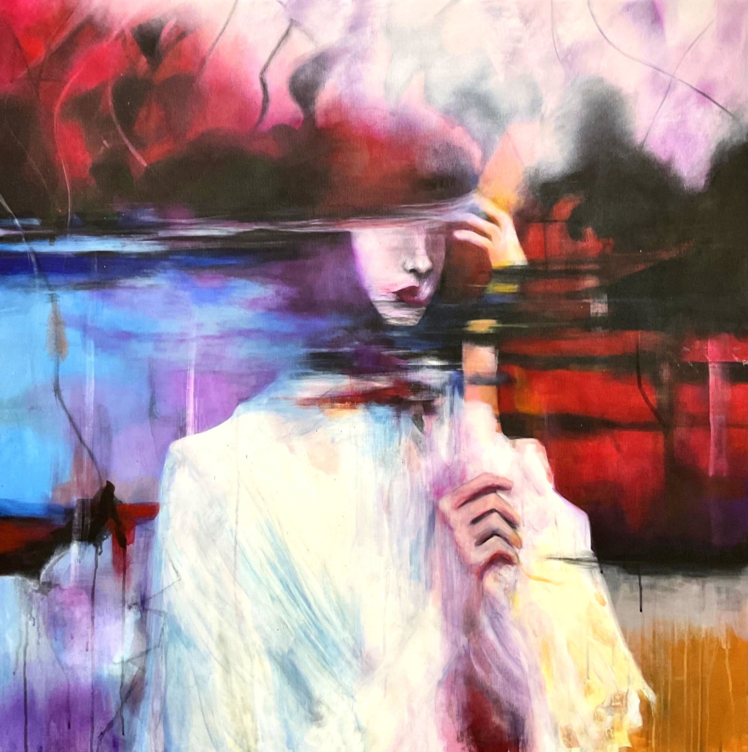 Sekatekniikka ja öljymaali kankaalle. Mitat: 100 x 100 x 3,7 cm. Valmistunut vuonna 2025. Identities on maalattu 100% puuvillakankaalle, joka on pingotettu mäntykiilakehykseen. Taulu on ripustusvalmis.