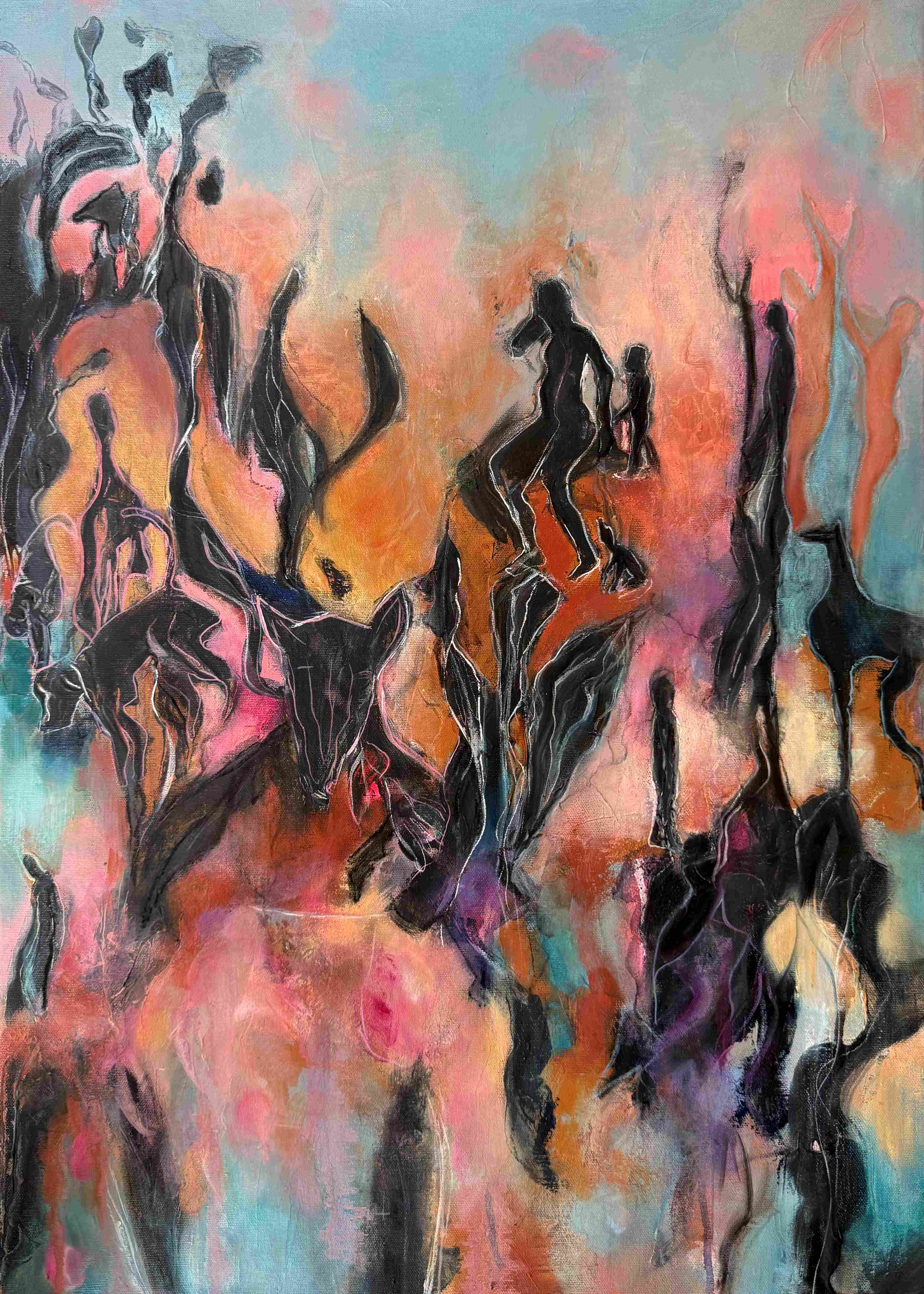 Sekatekniikka ja öljyväri kankaalle. Mitat: 50 x 70 x 3,7 cm. Valmistunut vuonna 2025. Luominen on maalattu 100% puuvillakankaalle, joka on pingotettu mäntykiilakehykseen. Taulu on ripustusvalmis.