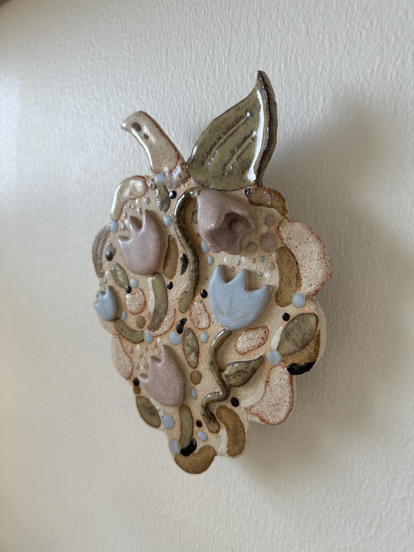 Seinäreliefi, n.21x16 cm. Kivitavara, lasite. Signeerattu. Työn taakse on liimattu ripustuspala, josta sen saa ripustettua seinälle.