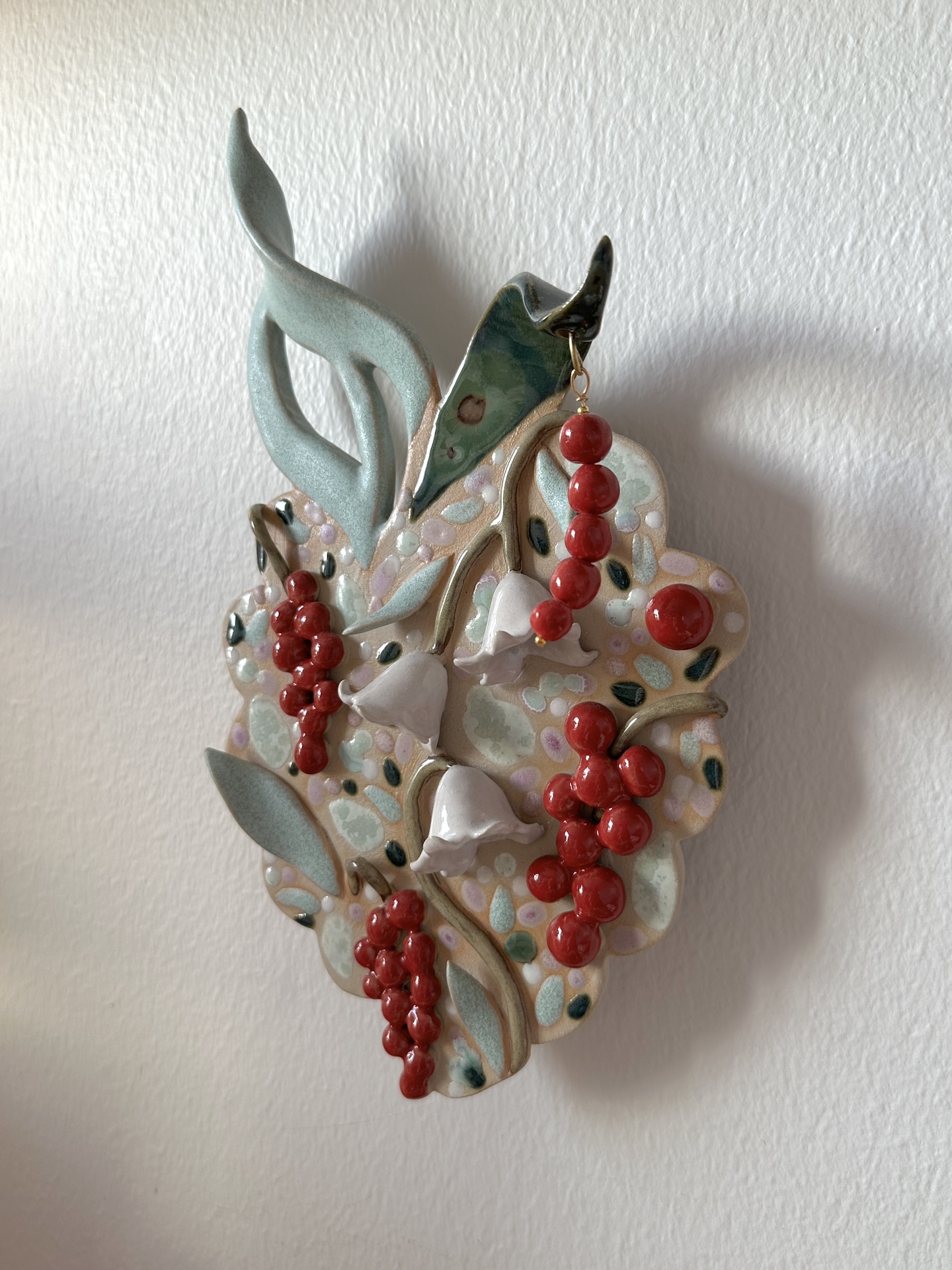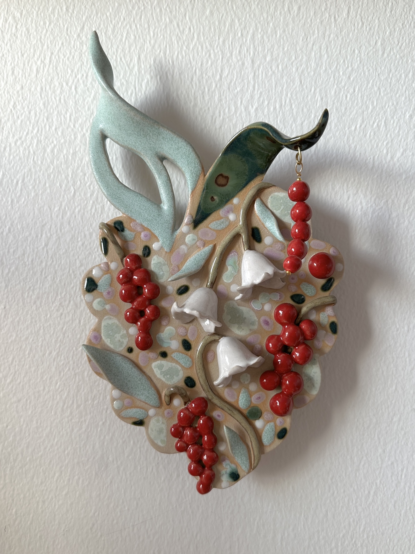 Seinäreliefi, 26 x 15 cm. Kivitavara, lasite. Signeerattu. Työn taakse on liimattu ripustuspala, josta sen saa ripustettua seinälle. Työn asentoa seinällä voi hieman säätää.