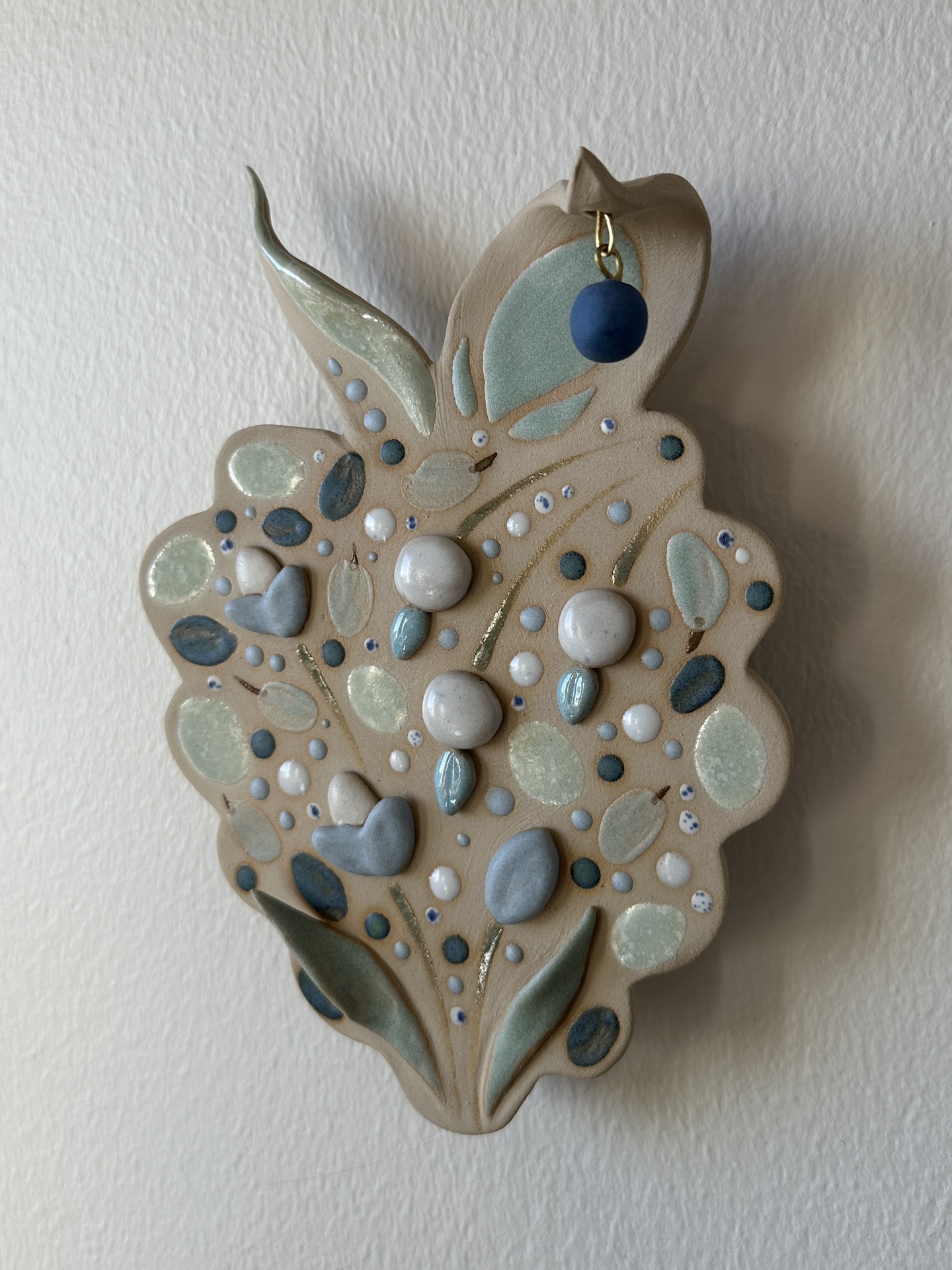 Seinäreliefi, 22 x 15,5 cm. Kivitavara, lasite. Signeerattu. Työn taakse on liimattu ripustuspala, josta sen saa ripustettua seinälle. Työn asentoa seinällä voi hieman säätää.
