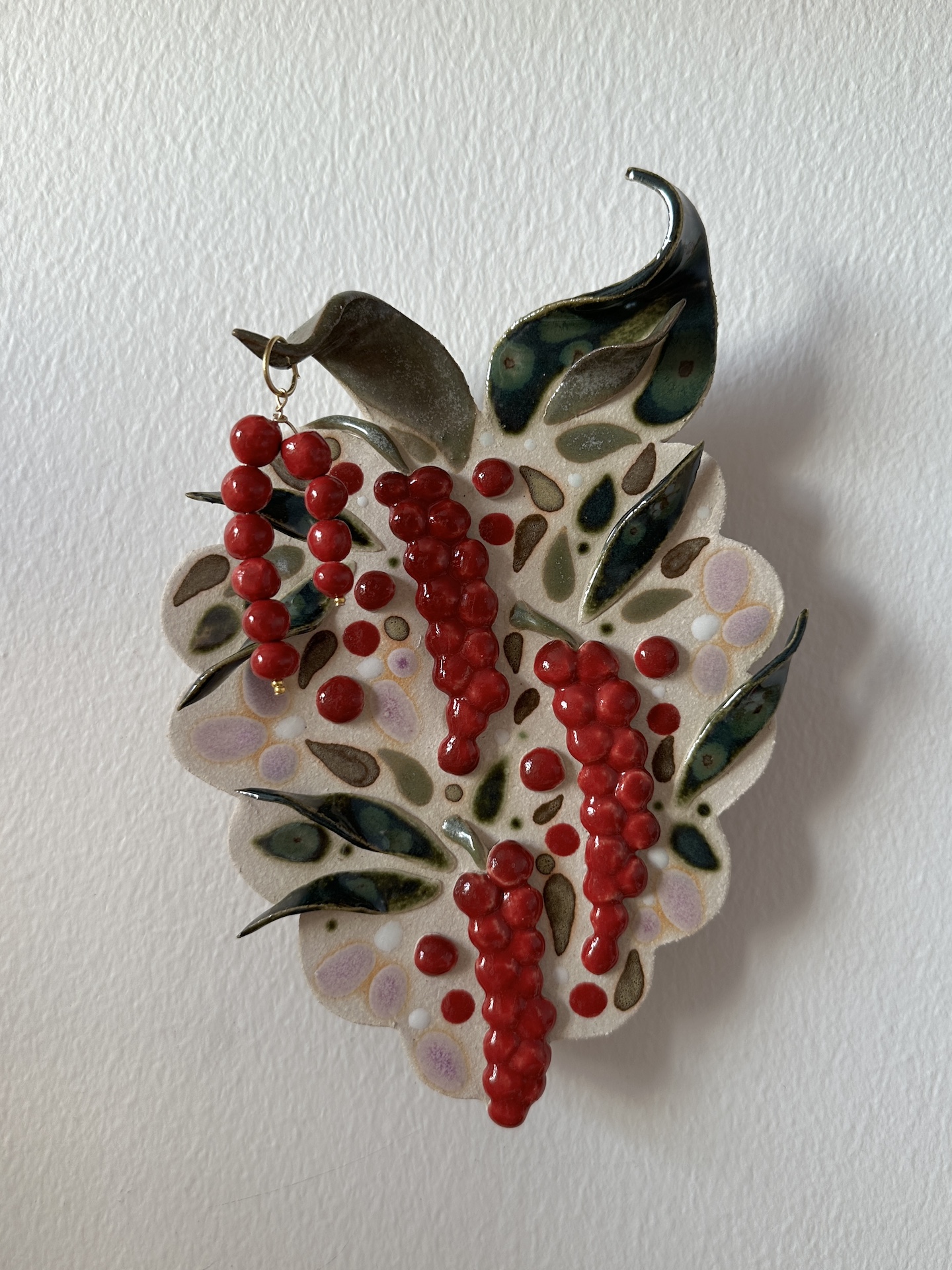 Seinäreliefi, 22 x 15 cm. Kivitavara, lasite. Signeerattu. Työn taakse on liimattu ripustuspala, josta sen saa ripustettua seinälle. Työn asentoa seinällä voi hieman säätää.