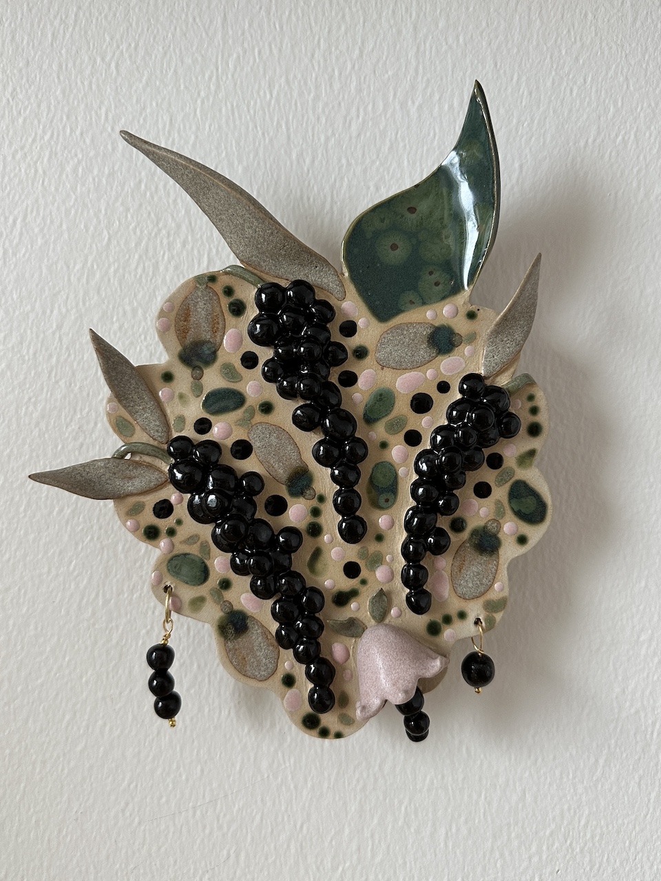 Seinäreliefi, 21 x 17 cm. Kivitavara, lasite. Signeerattu. Työn taakse on liimattu ripustuspala, josta sen saa ripustettua seinälle. Työn asentoa seinällä voi hieman säätää.